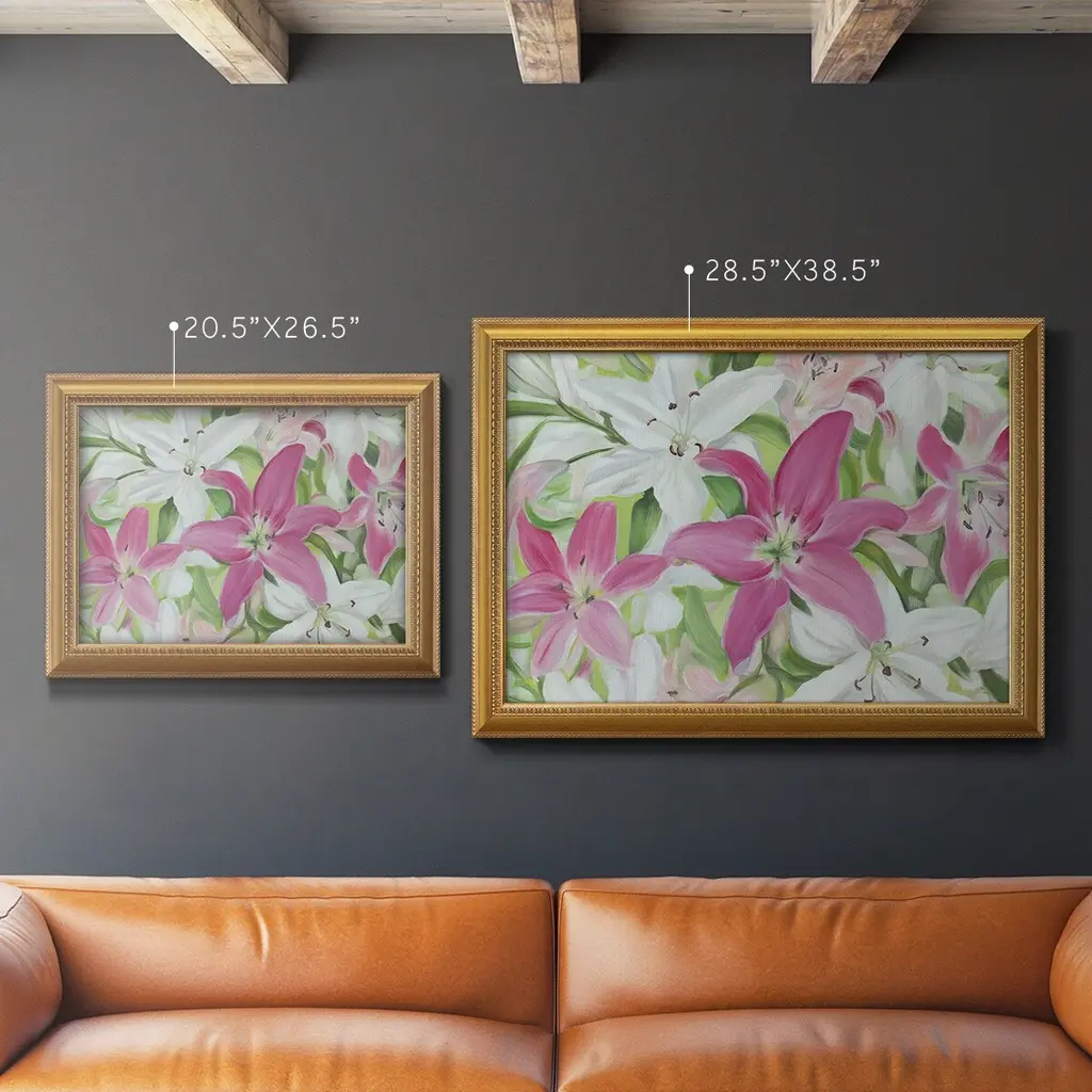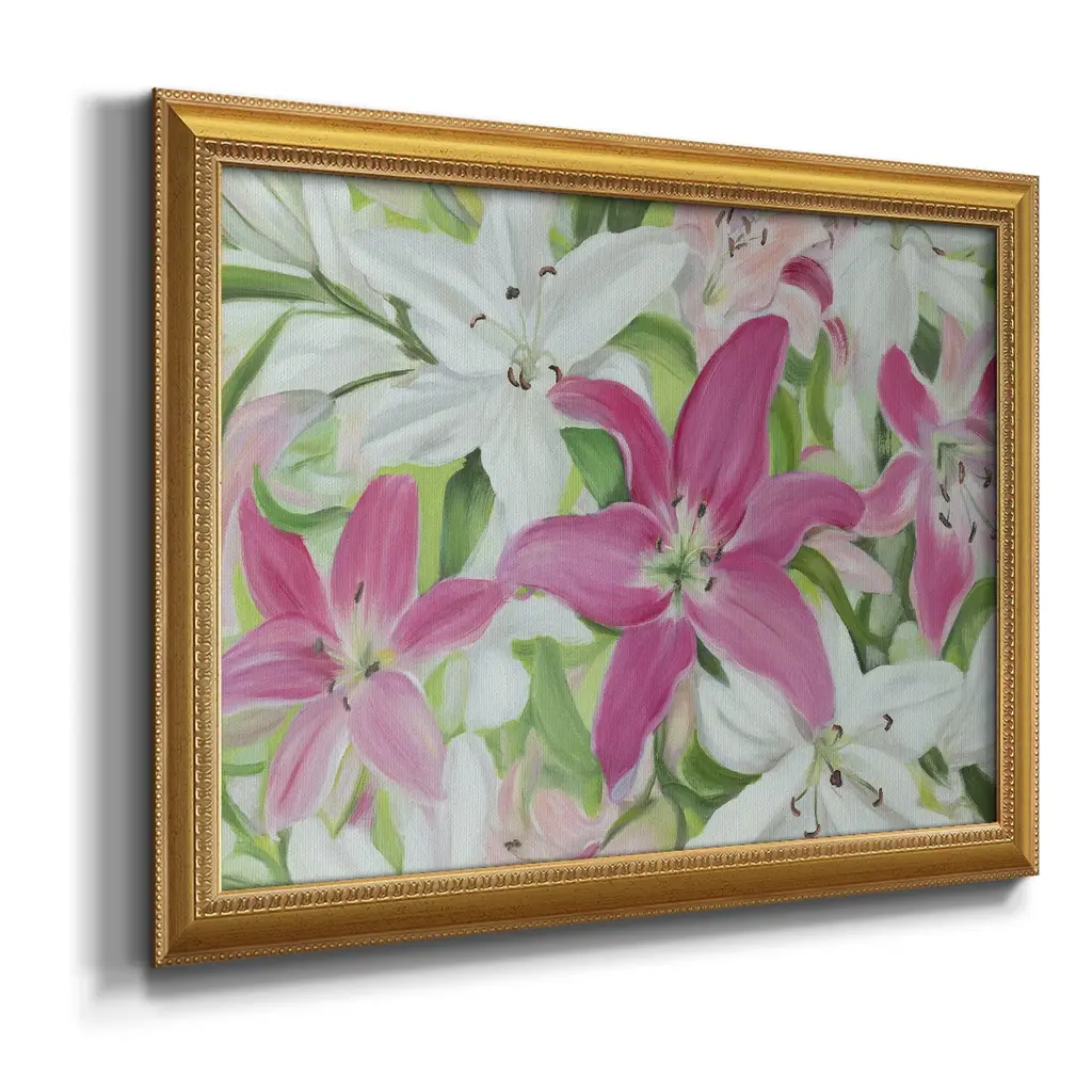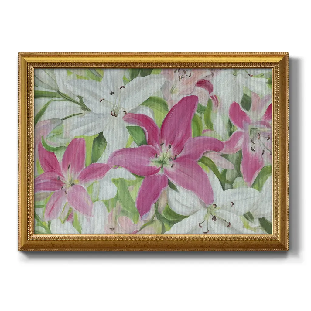 Pink and White Lilies III Premium Framed Canvas- Ready to Hang A Premium Framed Canvas created to last. Framed in distressed wood and available in an array of sizes and colors Featuring a beveled a solid wood stretcher bar, each piece comes ready to hand 3 SIZES AVAILABLE 16''X20'' - Overall Size 18'X27'' - Overall Size 24''x36'' - Overall Size Each piece is made to order. Each piece comes with hanging hardware. Made in the USA Ready to Hang Giclee Paper Print Acrylic Glass Beveled Matt Board