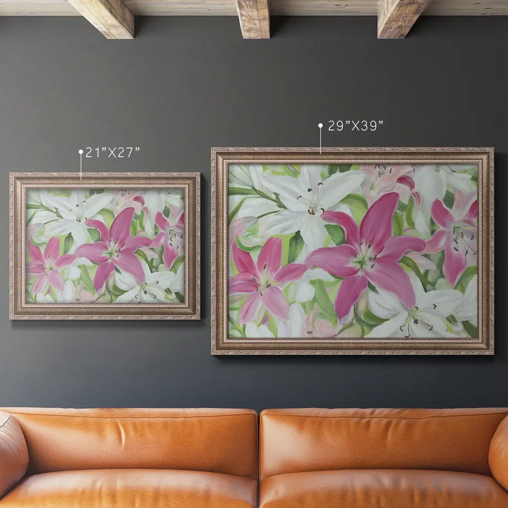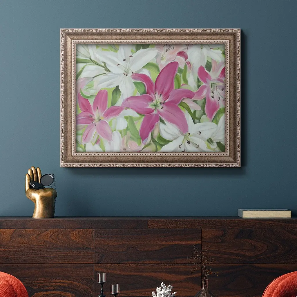 Pink and White Lilies III Premium Framed Canvas- Ready to Hang A Premium Framed Canvas created to last. Framed in distressed wood and available in an array of sizes and colors Featuring a beveled a solid wood stretcher bar, each piece comes ready to hand 3 SIZES AVAILABLE 16''X20'' - Overall Size 18'X27'' - Overall Size 24''x36'' - Overall Size Each piece is made to order. Each piece comes with hanging hardware. Made in the USA Ready to Hang Giclee Paper Print Acrylic Glass Beveled Matt Board