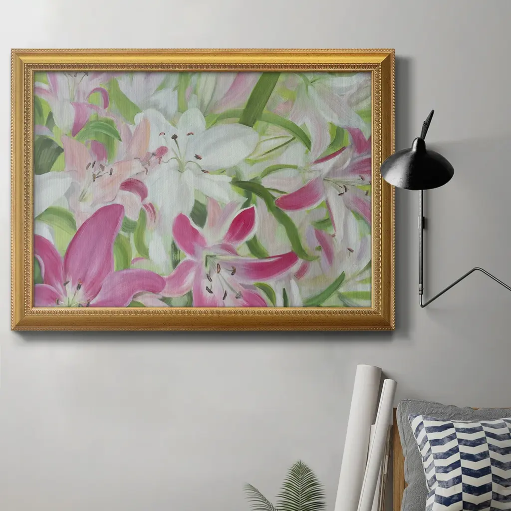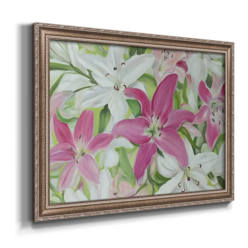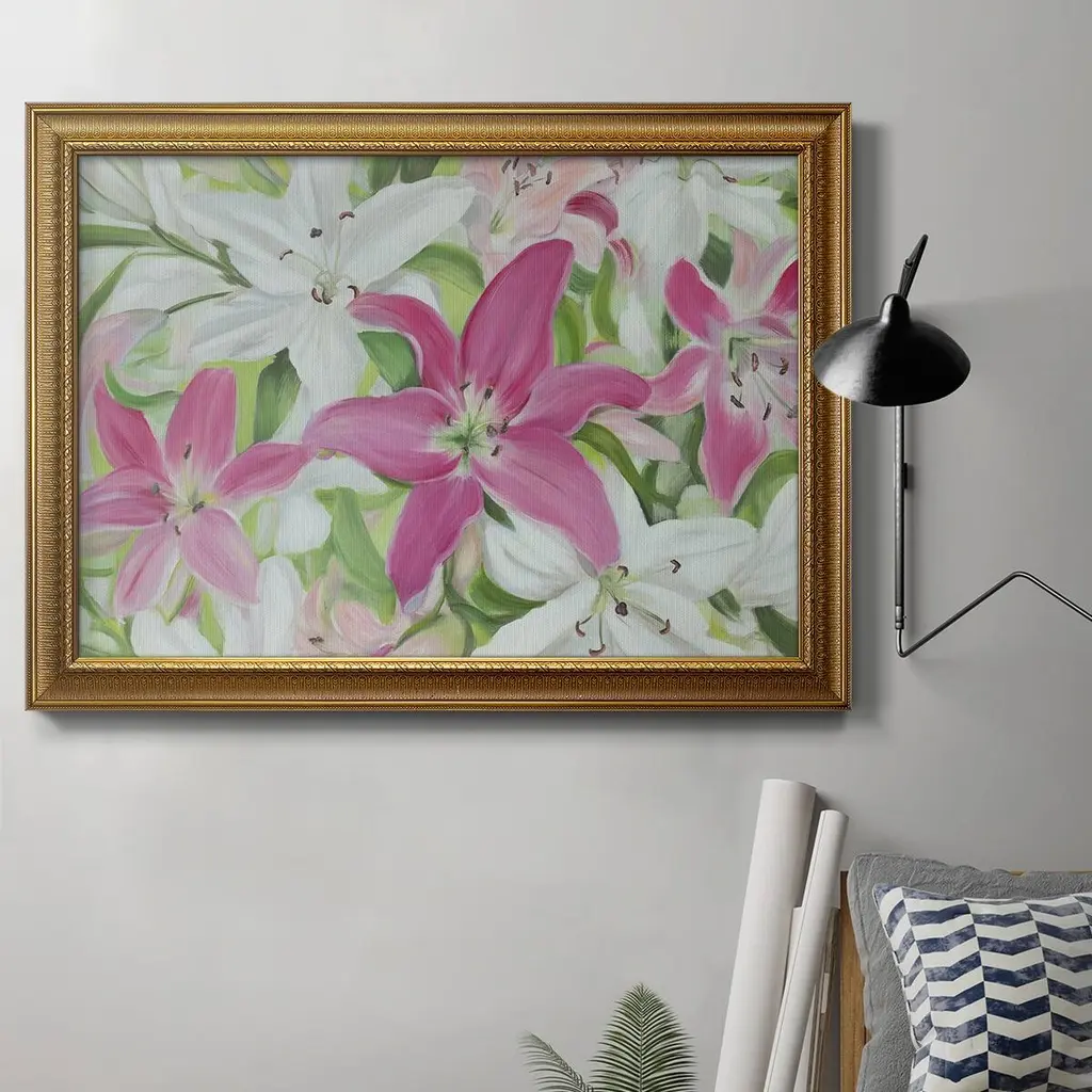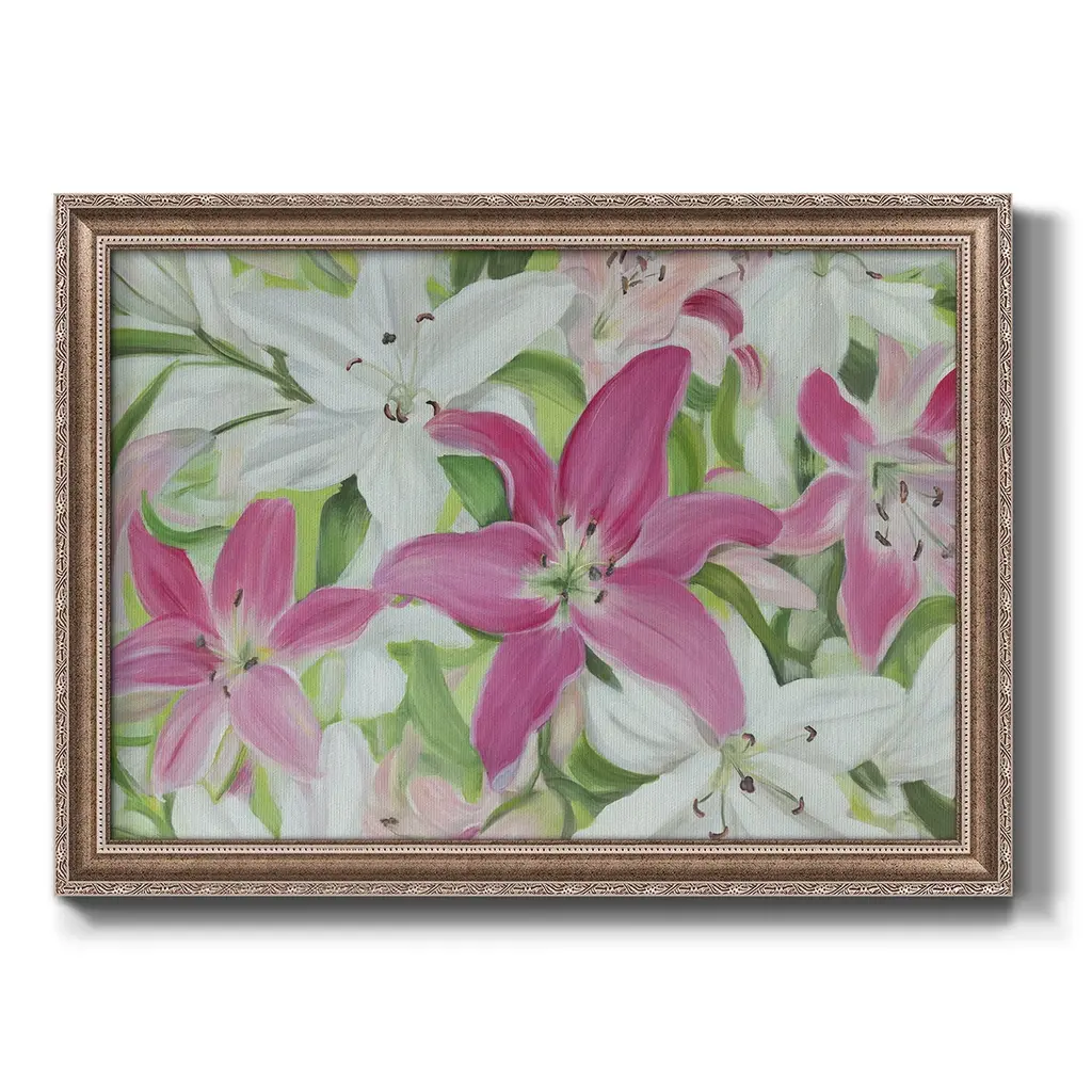 Pink and White Lilies III Premium Framed Canvas- Ready to Hang A Premium Framed Canvas created to last. Framed in distressed wood and available in an array of sizes and colors Featuring a beveled a solid wood stretcher bar, each piece comes ready to hand 3 SIZES AVAILABLE 16''X20'' - Overall Size 18'X27'' - Overall Size 24''x36'' - Overall Size Each piece is made to order. Each piece comes with hanging hardware. Made in the USA Ready to Hang Giclee Paper Print Acrylic Glass Beveled Matt Board