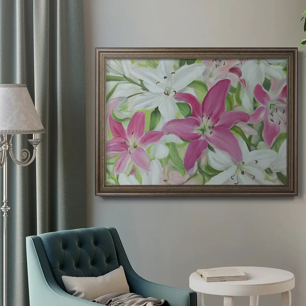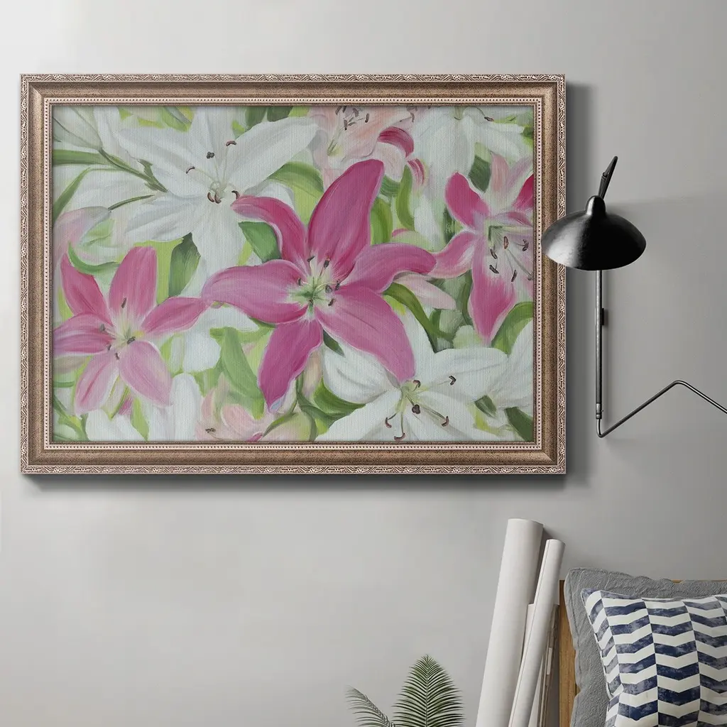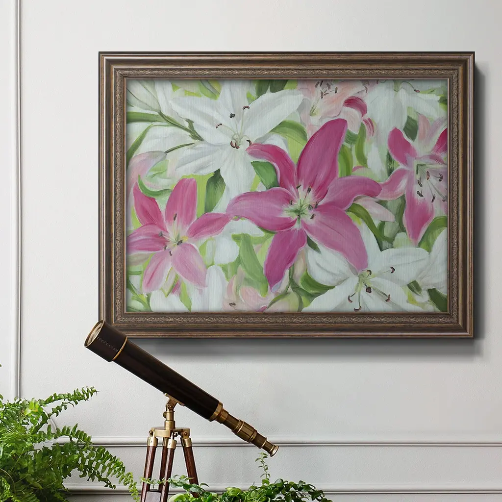 Pink and White Lilies III Premium Framed Canvas- Ready to Hang A Premium Framed Canvas created to last. Framed in distressed wood and available in an array of sizes and colors Featuring a beveled a solid wood stretcher bar, each piece comes ready to hand 3 SIZES AVAILABLE 16''X20'' - Overall Size 18'X27'' - Overall Size 24''x36'' - Overall Size Each piece is made to order. Each piece comes with hanging hardware. Made in the USA Ready to Hang Giclee Paper Print Acrylic Glass Beveled Matt Board