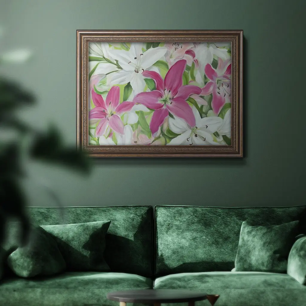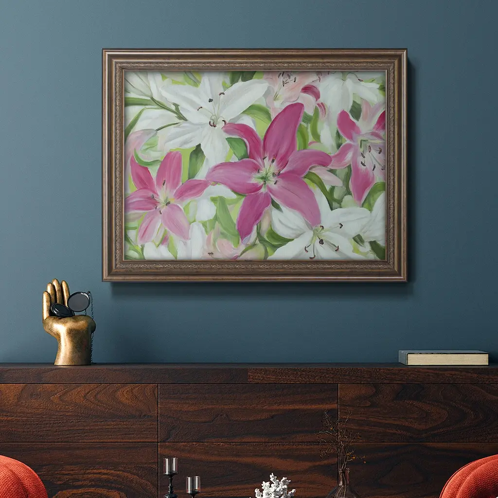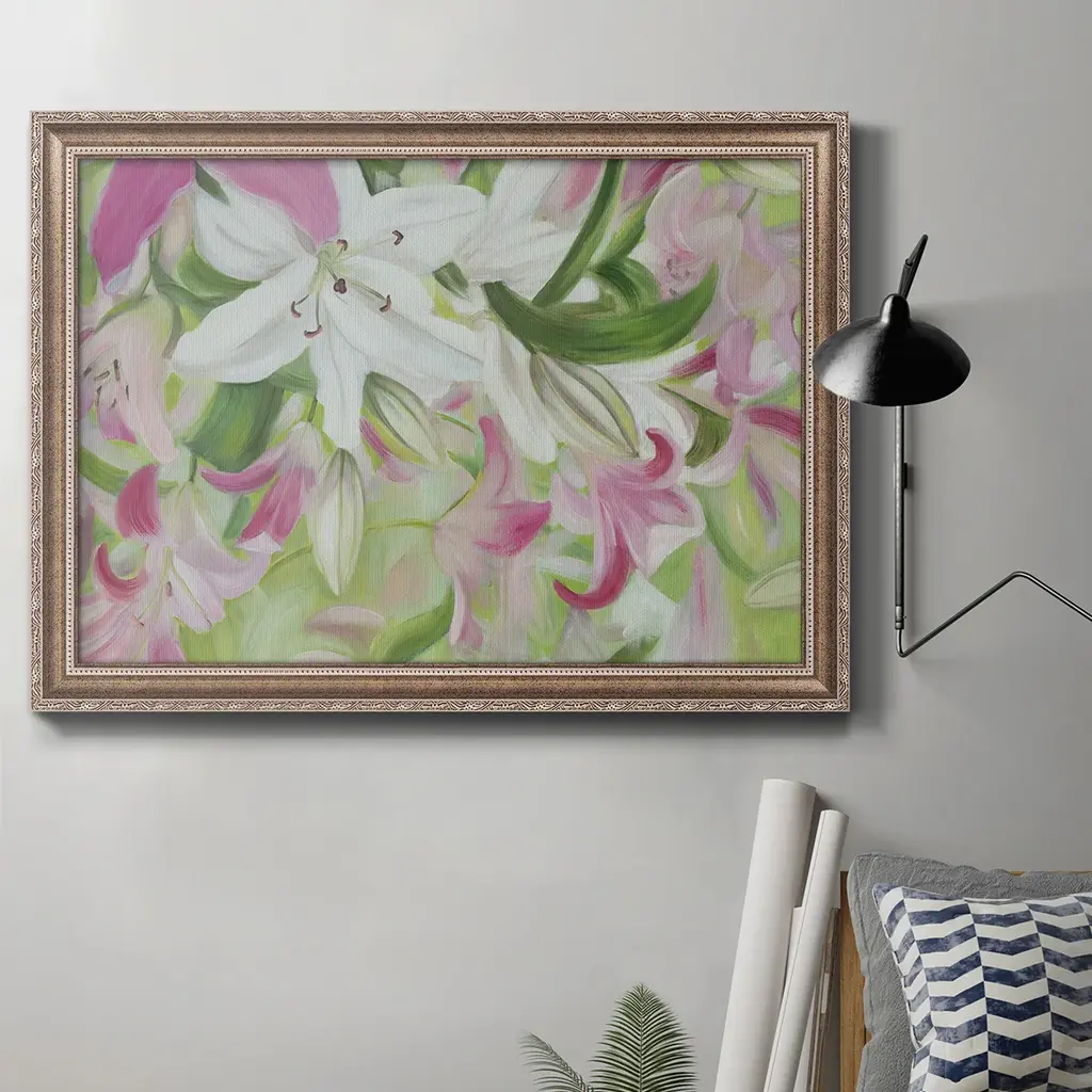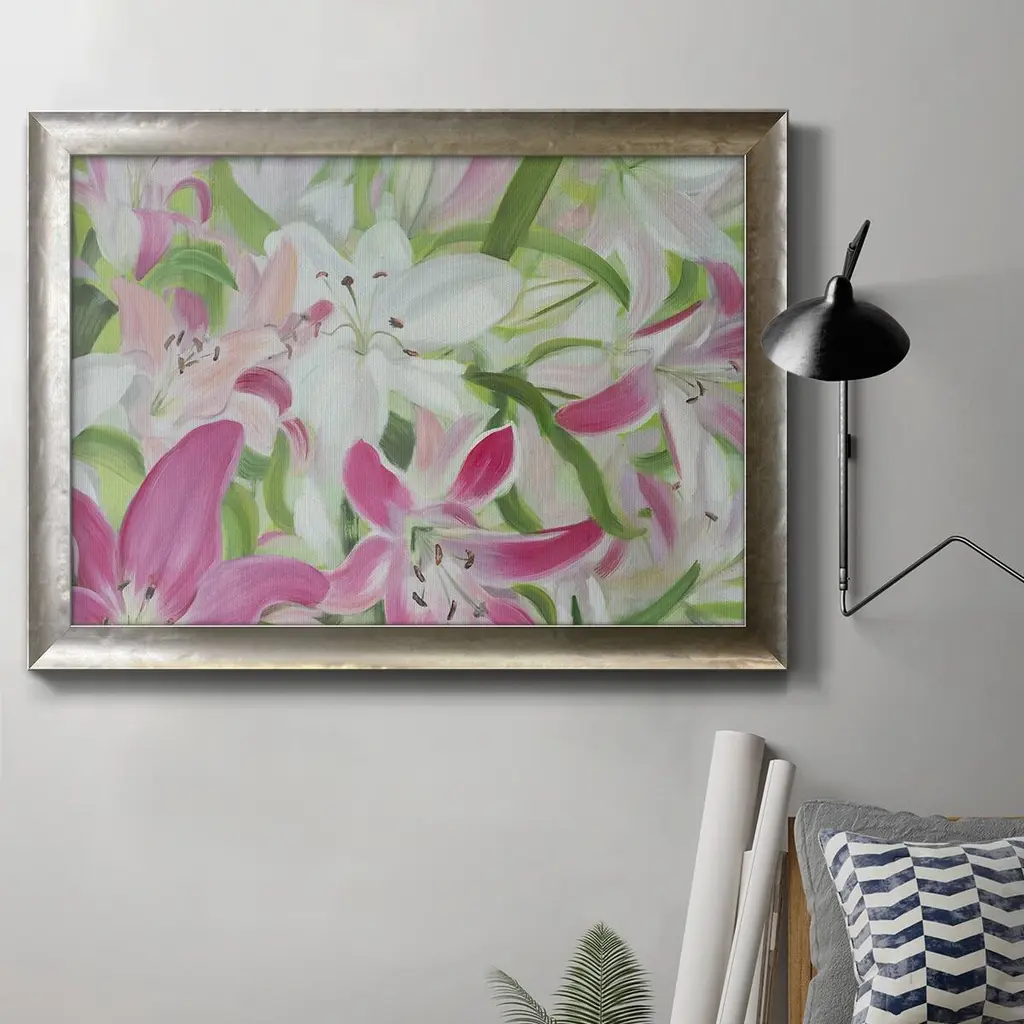 Pink and White Lilies III Premium Framed Canvas- Ready to Hang A Premium Framed Canvas created to last. Framed in distressed wood and available in an array of sizes and colors Featuring a beveled a solid wood stretcher bar, each piece comes ready to hand 3 SIZES AVAILABLE 16''X20'' - Overall Size 18'X27'' - Overall Size 24''x36'' - Overall Size Each piece is made to order. Each piece comes with hanging hardware. Made in the USA Ready to Hang Giclee Paper Print Acrylic Glass Beveled Matt Board