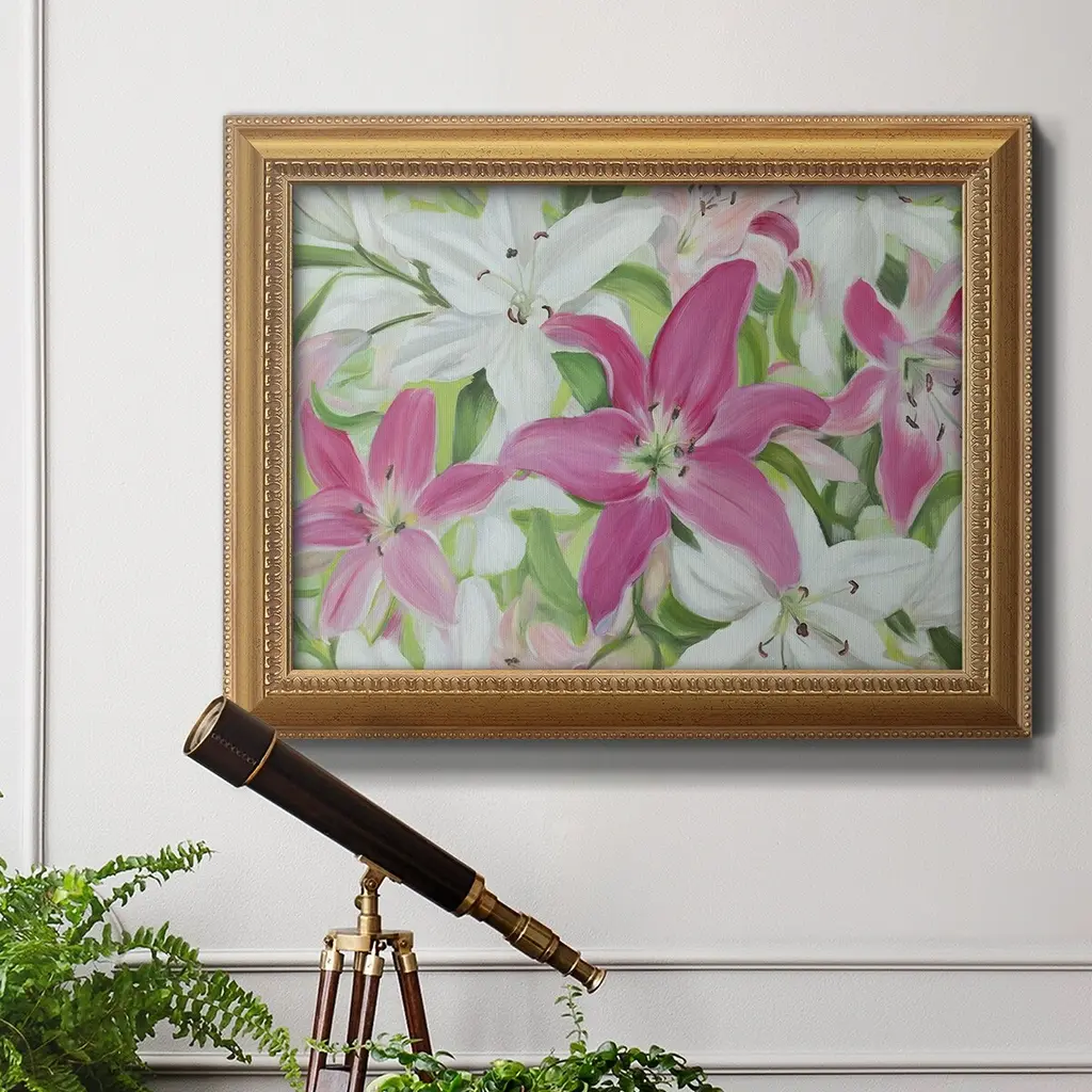 Pink and White Lilies III Premium Framed Canvas- Ready to Hang A Premium Framed Canvas created to last. Framed in distressed wood and available in an array of sizes and colors Featuring a beveled a solid wood stretcher bar, each piece comes ready to hand 3 SIZES AVAILABLE 16''X20'' - Overall Size 18'X27'' - Overall Size 24''x36'' - Overall Size Each piece is made to order. Each piece comes with hanging hardware. Made in the USA Ready to Hang Giclee Paper Print Acrylic Glass Beveled Matt Board