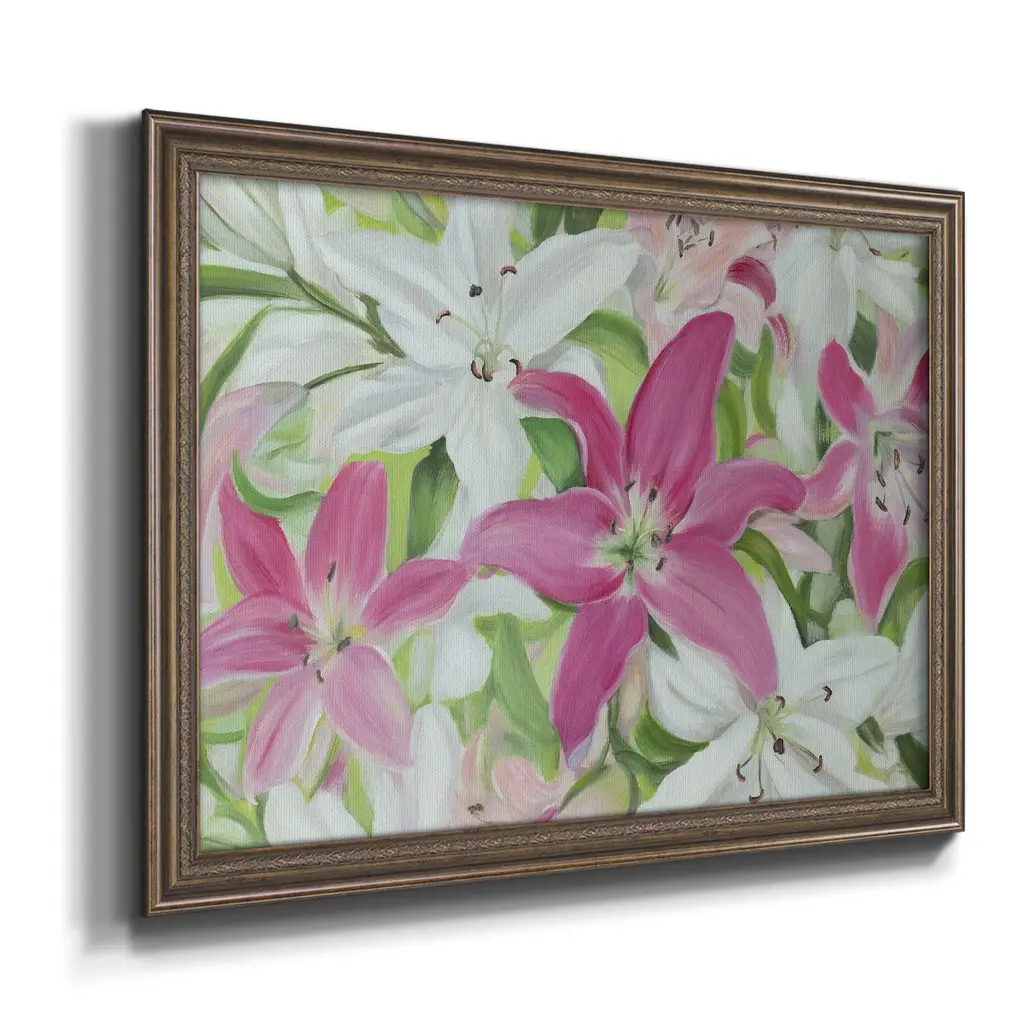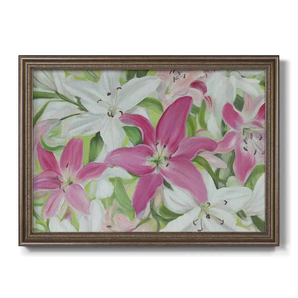 Pink and White Lilies III Premium Framed Canvas- Ready to Hang A Premium Framed Canvas created to last. Framed in distressed wood and available in an array of sizes and colors Featuring a beveled a solid wood stretcher bar, each piece comes ready to hand 3 SIZES AVAILABLE 16''X20'' - Overall Size 18'X27'' - Overall Size 24''x36'' - Overall Size Each piece is made to order. Each piece comes with hanging hardware. Made in the USA Ready to Hang Giclee Paper Print Acrylic Glass Beveled Matt Board