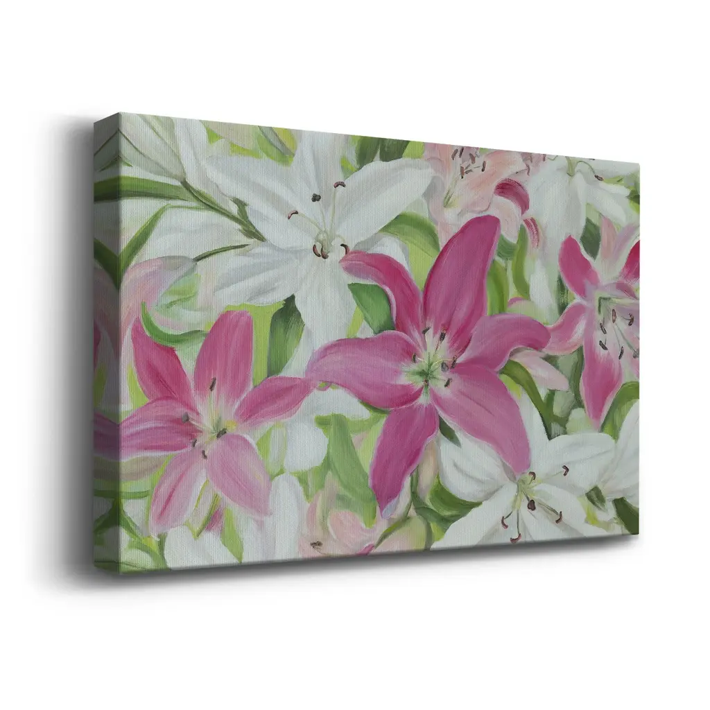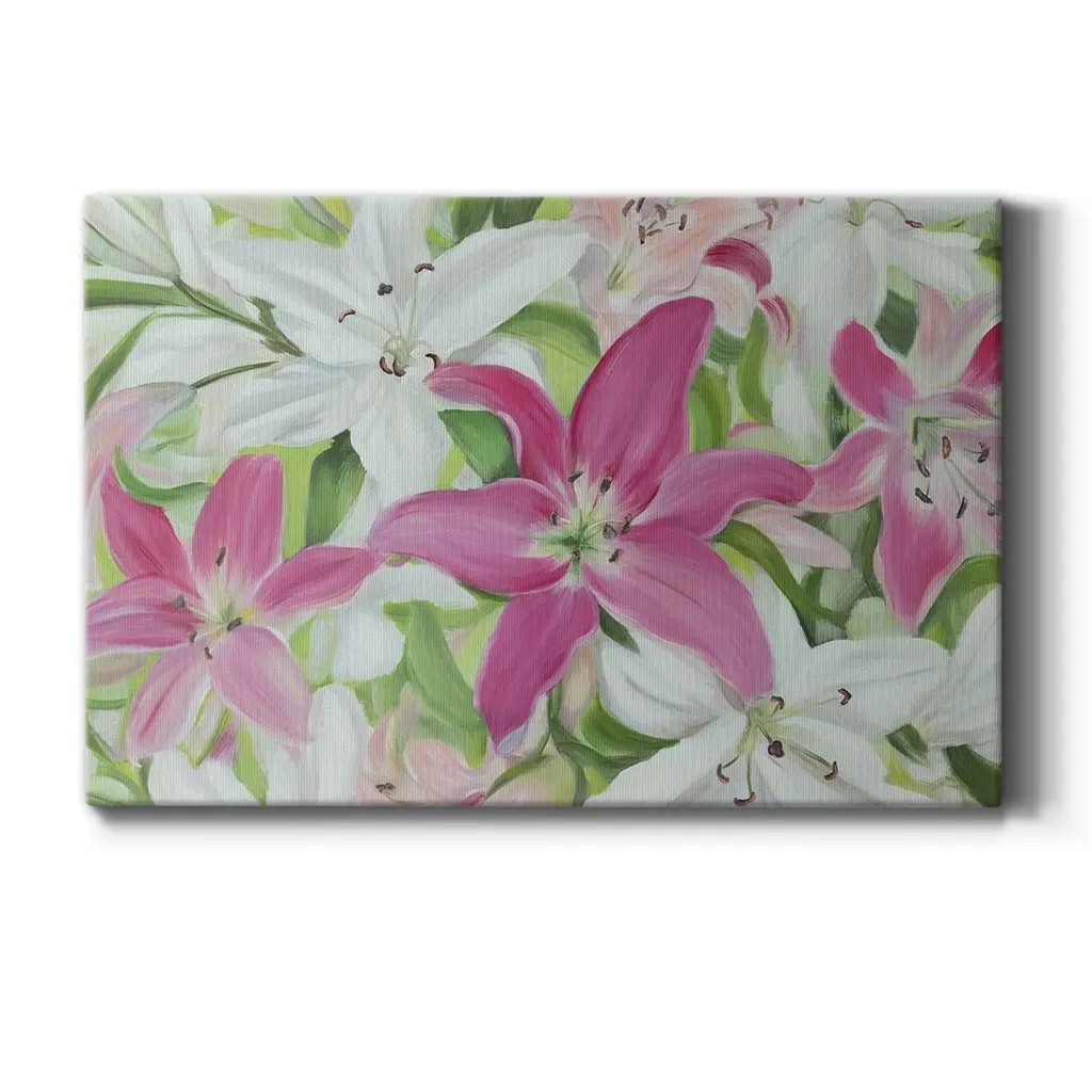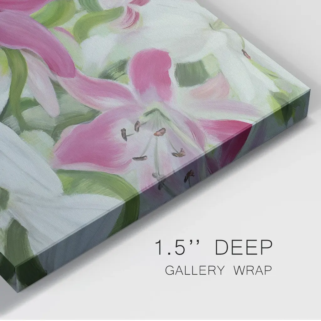 Pink and White Lilies III Premium Gallery Wrapped Canvas - Ready to Hang A premium hand stretched gallery wrapped canvas print created to last. Featuring a beveled a solid wood stretcher bar, each piece comes ready to hand 6 SIZES AVAILABLE 8''X12'' - Overall Size 12''X18'' - Overall Size 18''X27'' - Overall Size 24''x36'' - Overall Size 32''x48'' - Overall Size 40''x60'' - Overall Size Each piece is made to order. Built to Last Each piece comes ready to hang Solid wood stretcher Fade and Water resistant Made domestically