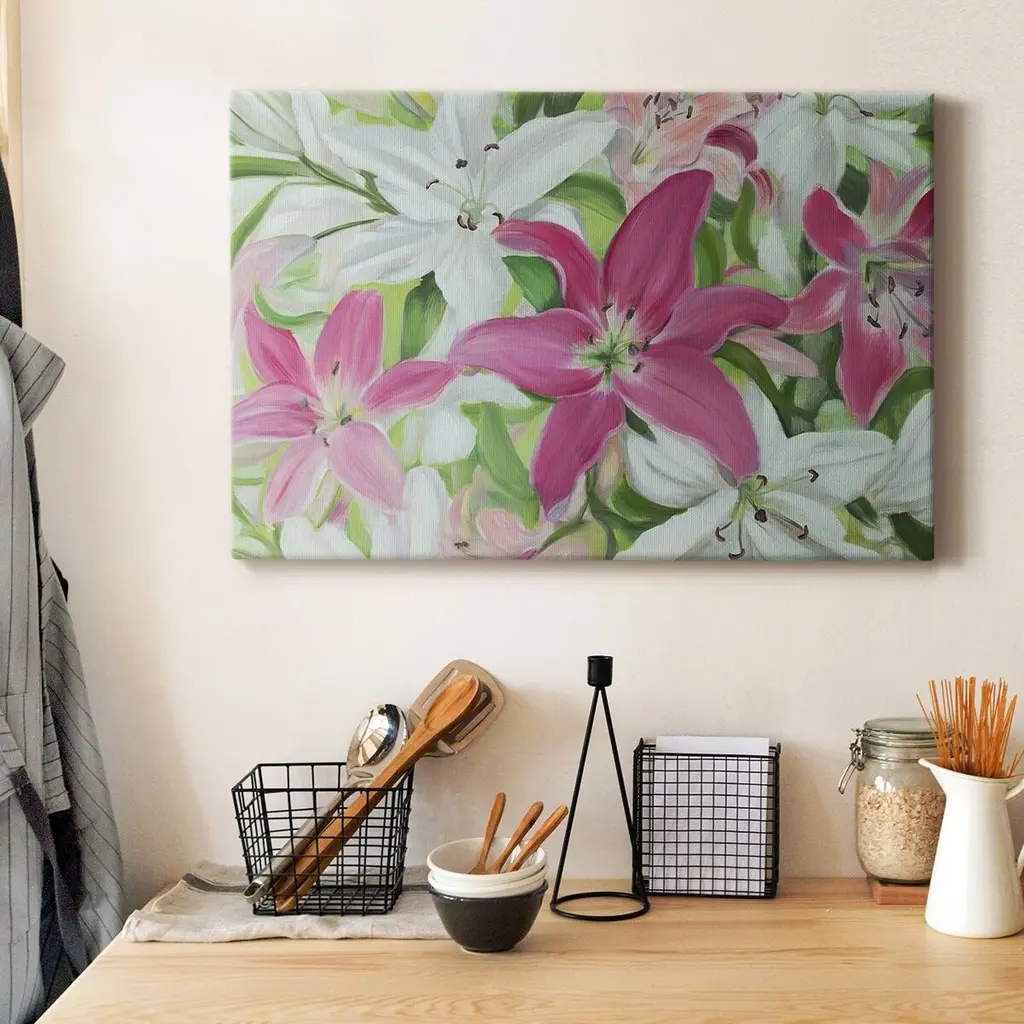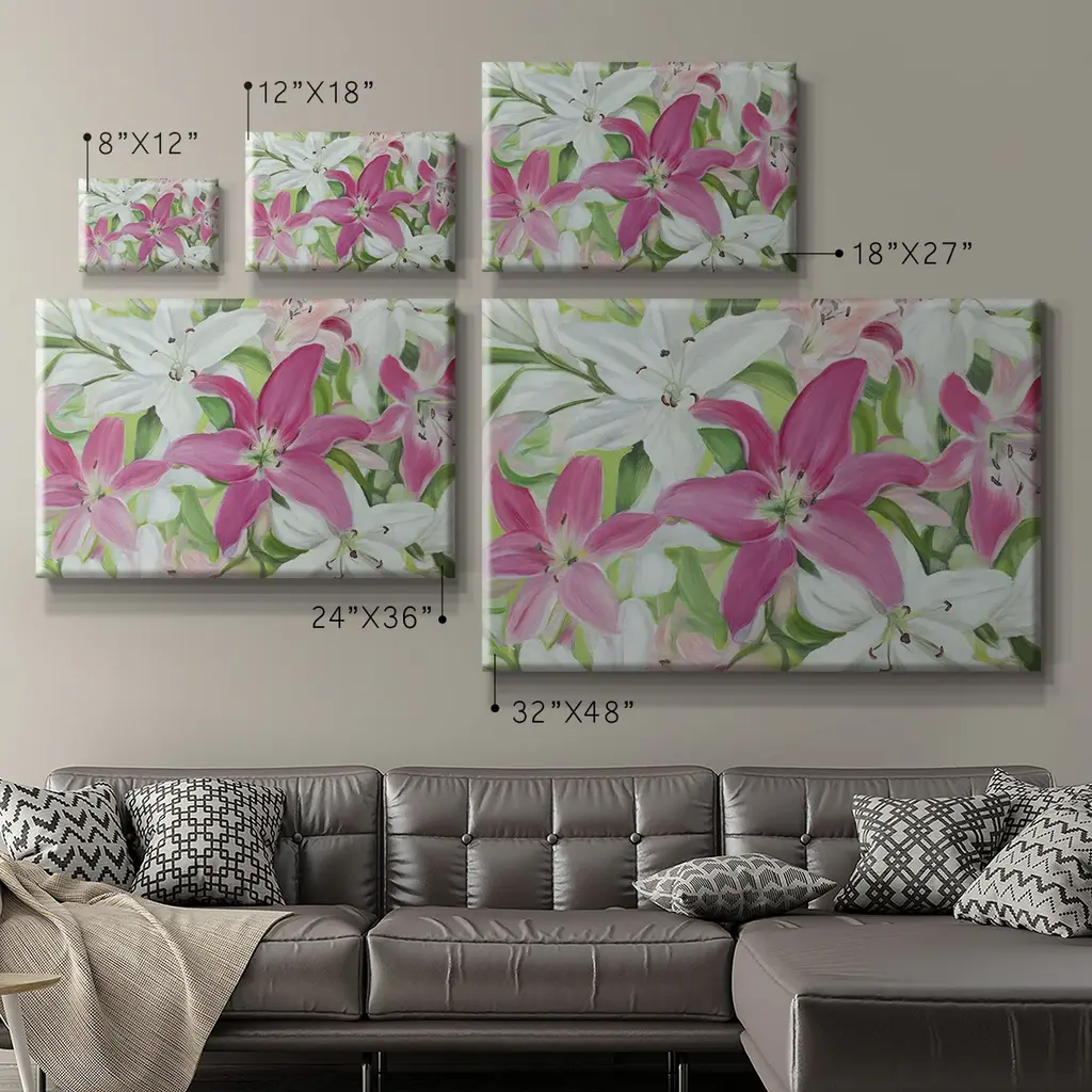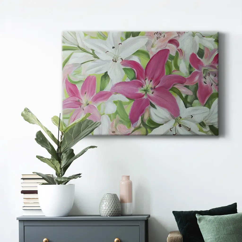 Pink and White Lilies III Premium Gallery Wrapped Canvas - Ready to Hang A premium hand stretched gallery wrapped canvas print created to last. Featuring a beveled a solid wood stretcher bar, each piece comes ready to hand 6 SIZES AVAILABLE 8''X12'' - Overall Size 12''X18'' - Overall Size 18''X27'' - Overall Size 24''x36'' - Overall Size 32''x48'' - Overall Size 40''x60'' - Overall Size Each piece is made to order. Built to Last Each piece comes ready to hang Solid wood stretcher Fade and Water resistant Made domestically