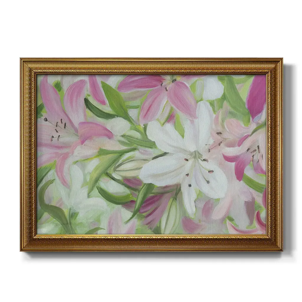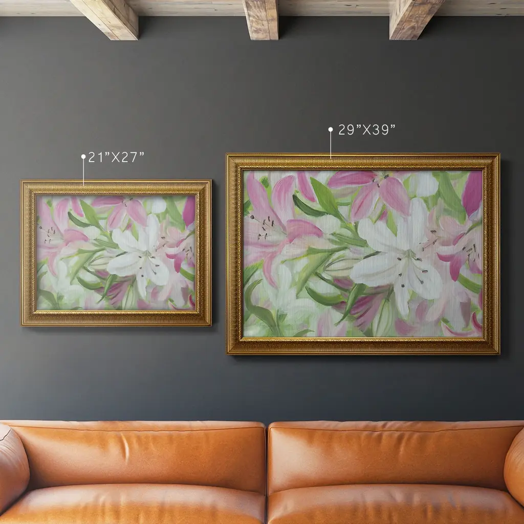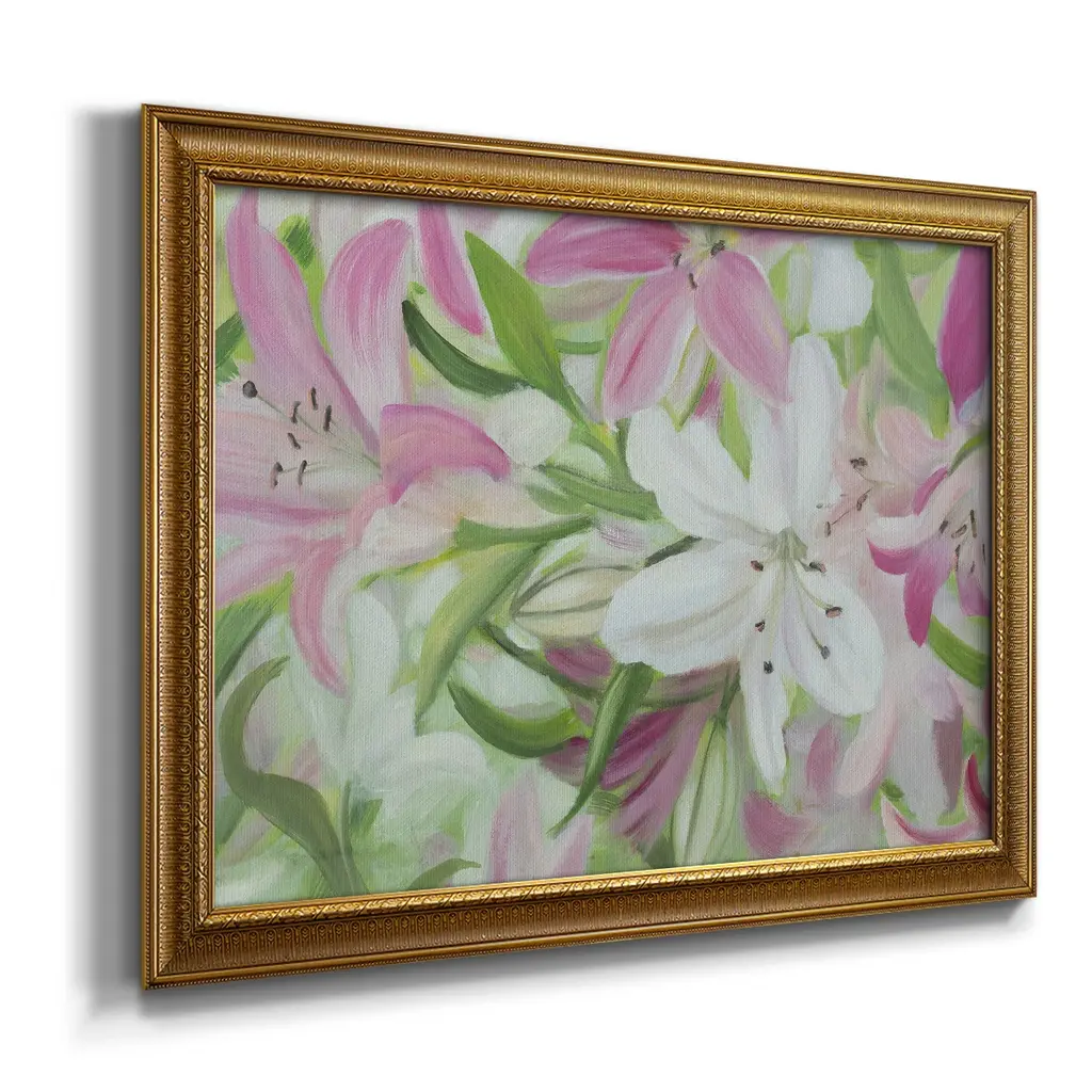Pink and White Lilies IV Premium Framed Canvas- Ready to Hang A Premium Framed Canvas created to last. Framed in distressed wood and available in an array of sizes and colors Featuring a beveled a solid wood stretcher bar, each piece comes ready to hand 3 SIZES AVAILABLE 16''X20'' - Overall Size 18'X27'' - Overall Size 24''x36'' - Overall Size Each piece is made to order. Each piece comes with hanging hardware. Made in the USA Ready to Hang Giclee Paper Print Acrylic Glass Beveled Matt Board