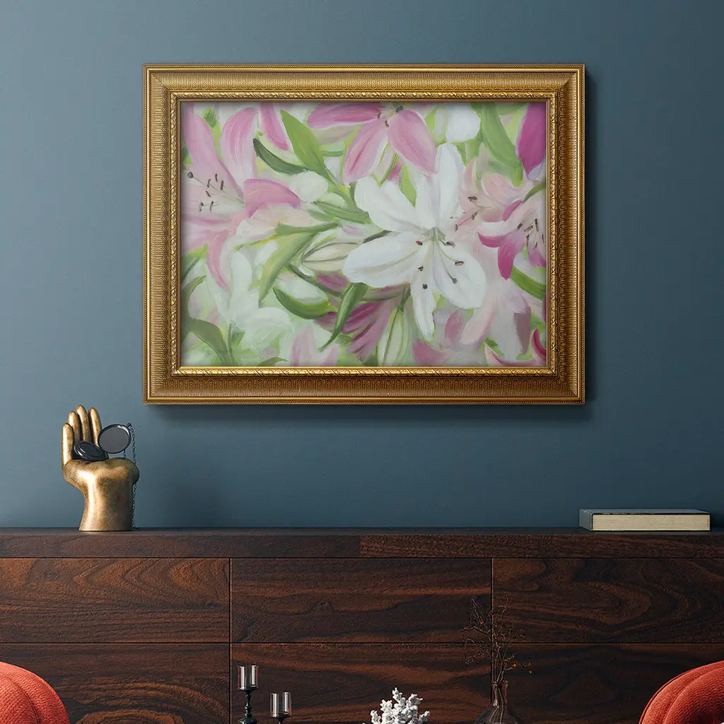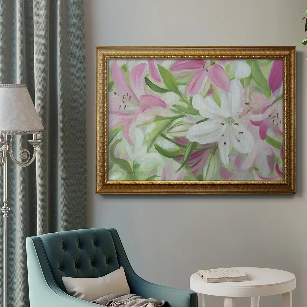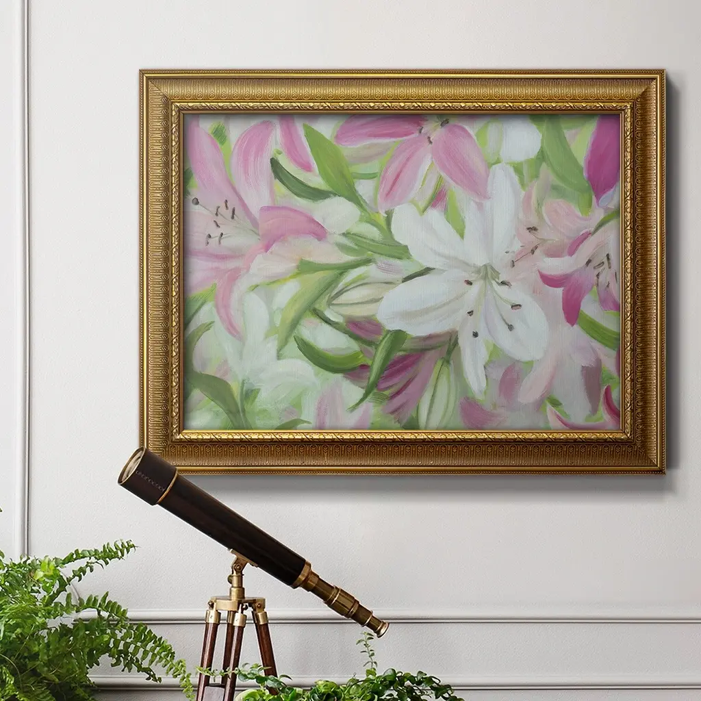 Pink and White Lilies IV Premium Framed Canvas- Ready to Hang A Premium Framed Canvas created to last. Framed in distressed wood and available in an array of sizes and colors Featuring a beveled a solid wood stretcher bar, each piece comes ready to hand 3 SIZES AVAILABLE 16''X20'' - Overall Size 18'X27'' - Overall Size 24''x36'' - Overall Size Each piece is made to order. Each piece comes with hanging hardware. Made in the USA Ready to Hang Giclee Paper Print Acrylic Glass Beveled Matt Board