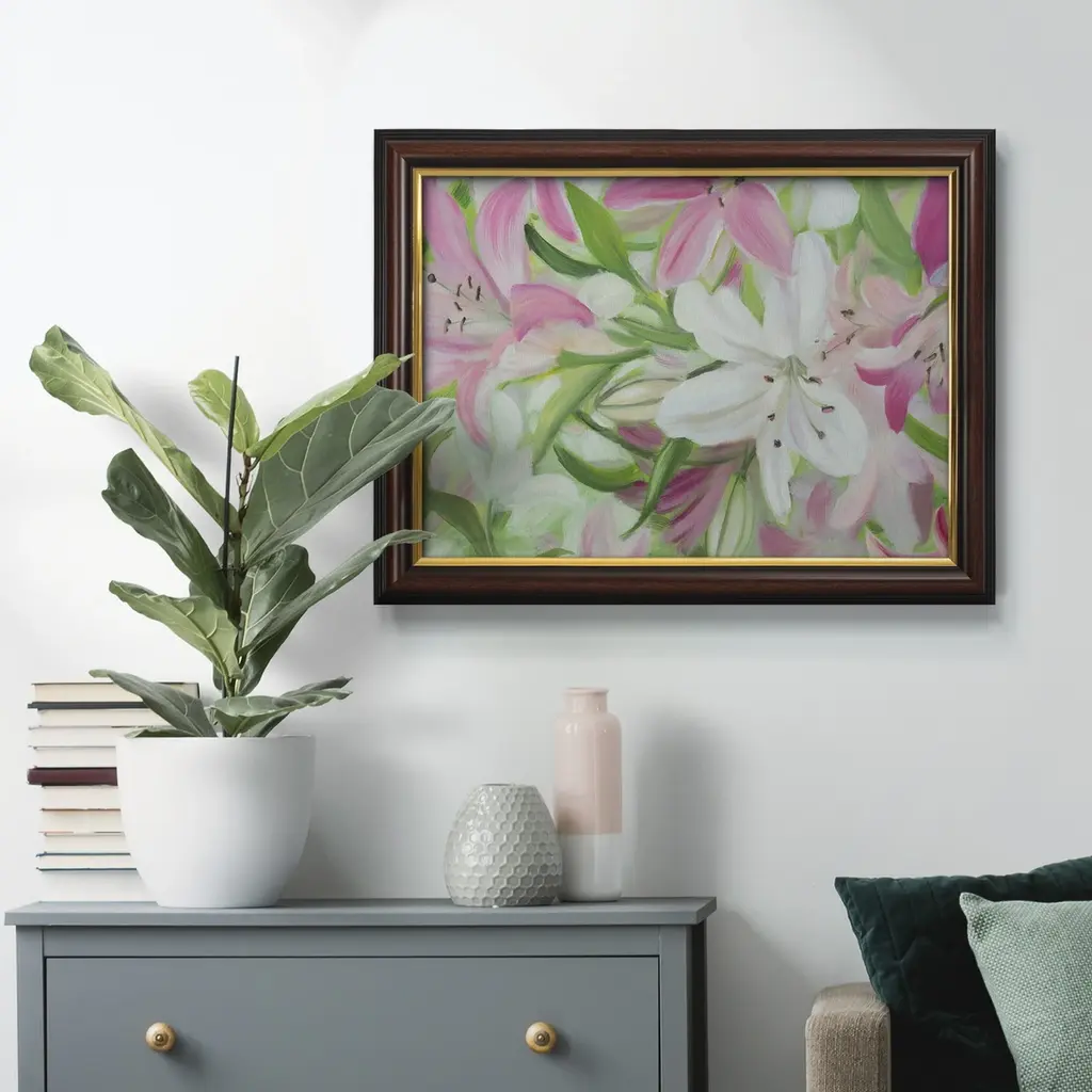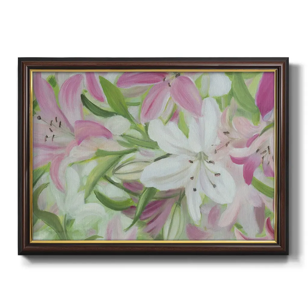 Pink and White Lilies IV Premium Framed Canvas- Ready to Hang A Premium Framed Canvas created to last. Framed in distressed wood and available in an array of sizes and colors Featuring a beveled a solid wood stretcher bar, each piece comes ready to hand 3 SIZES AVAILABLE 16''X20'' - Overall Size 18'X27'' - Overall Size 24''x36'' - Overall Size Each piece is made to order. Each piece comes with hanging hardware. Made in the USA Ready to Hang Giclee Paper Print Acrylic Glass Beveled Matt Board