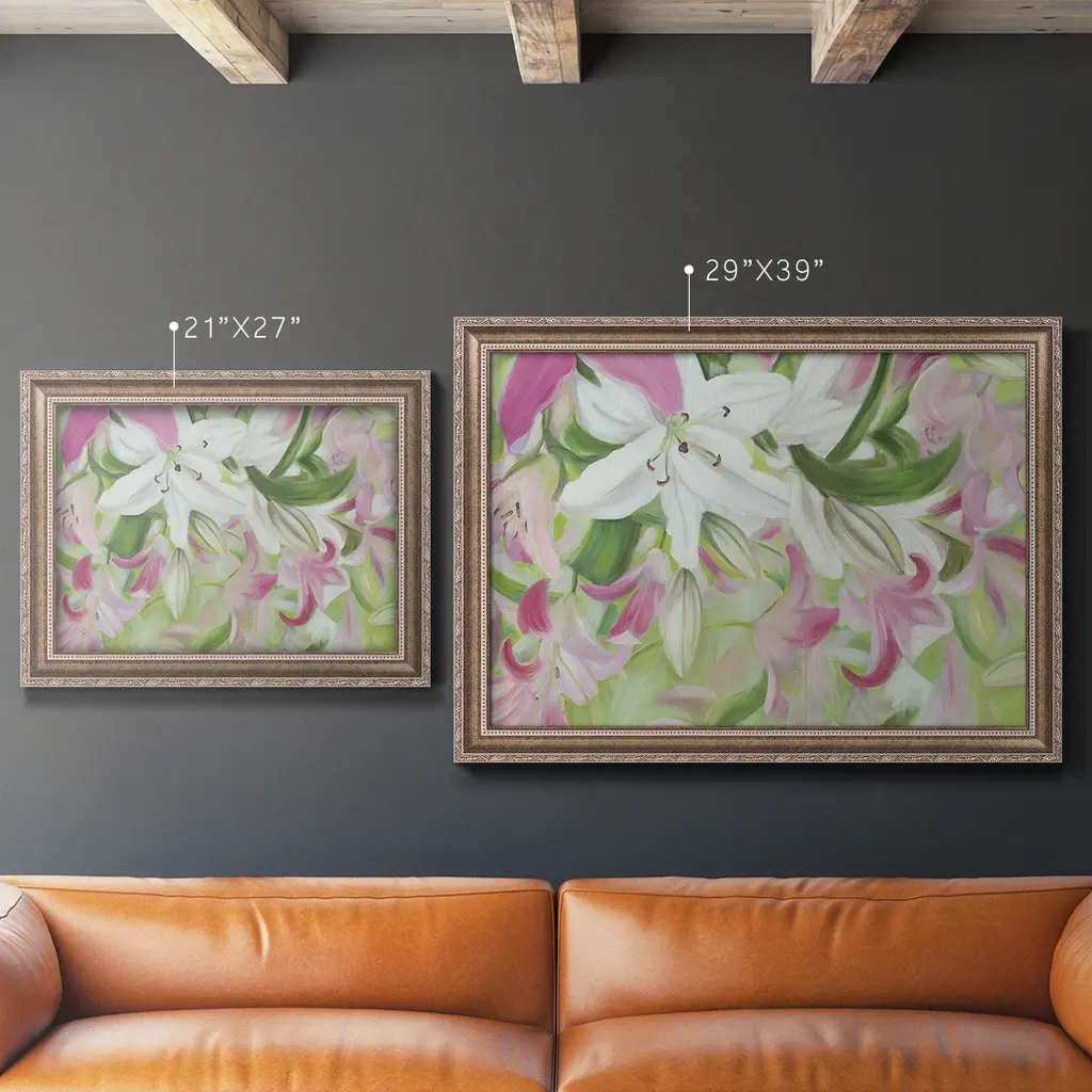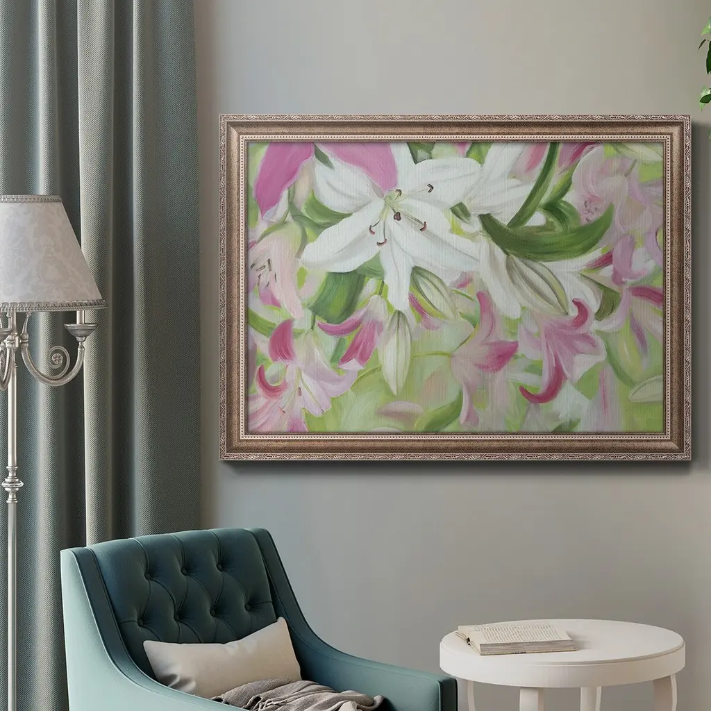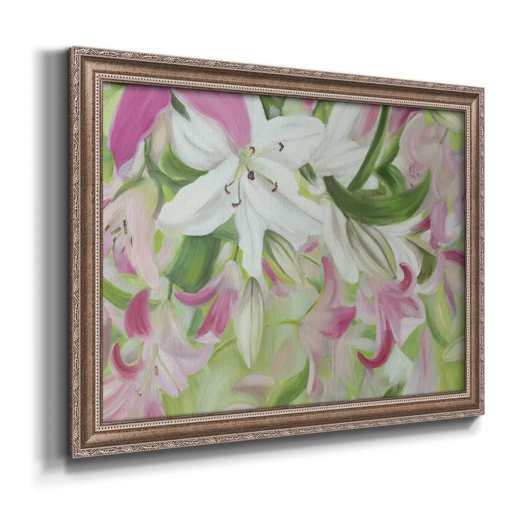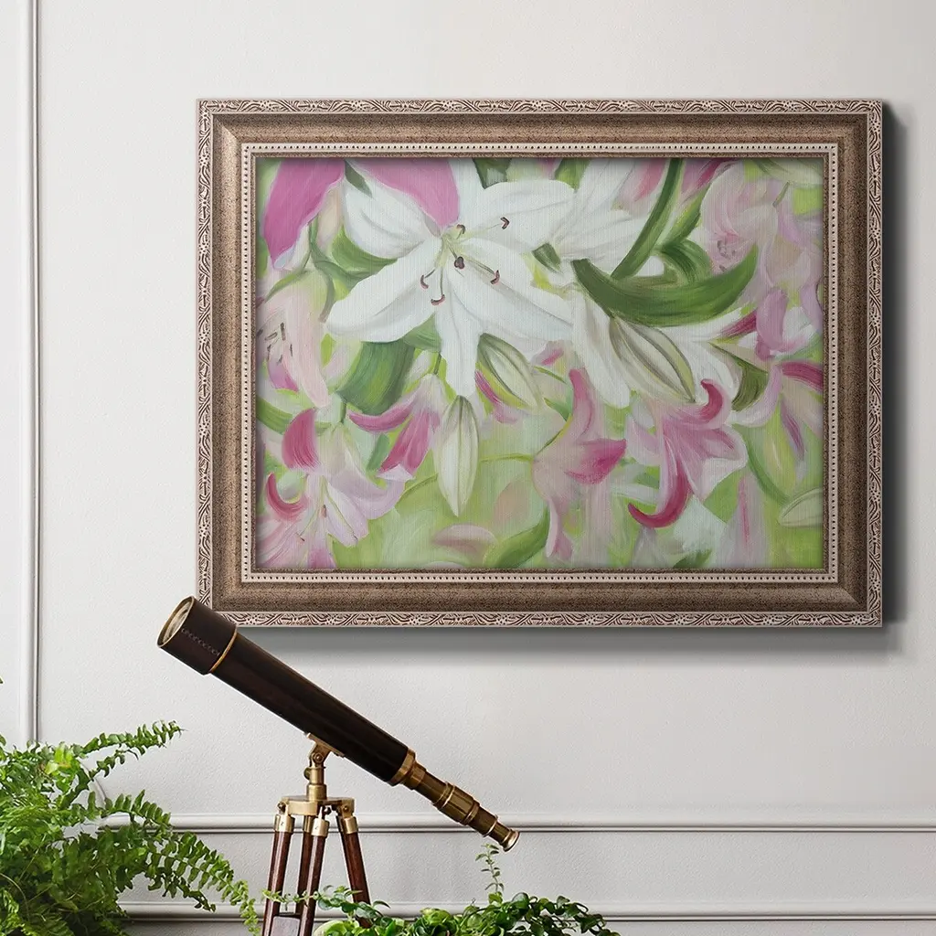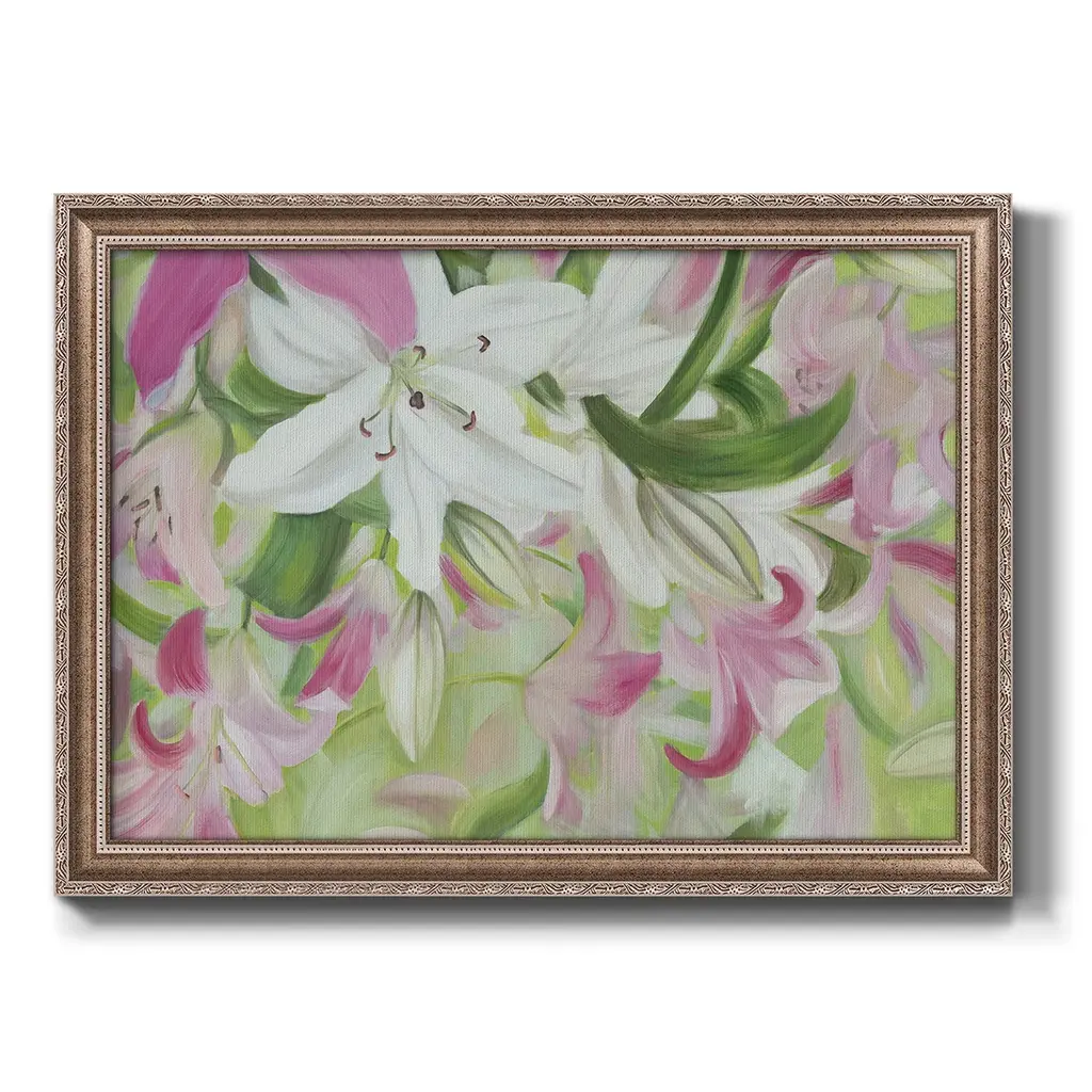 Pink and White Lilies V Premium Framed Canvas- Ready to Hang A Premium Framed Canvas created to last. Framed in distressed wood and available in an array of sizes and colors Featuring a beveled a solid wood stretcher bar, each piece comes ready to hand 3 SIZES AVAILABLE 16''X20'' - Overall Size 18'X27'' - Overall Size 24''x36'' - Overall Size Each piece is made to order. Each piece comes with hanging hardware. Made in the USA Ready to Hang Giclee Paper Print Acrylic Glass Beveled Matt Board