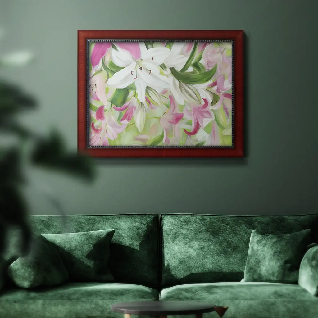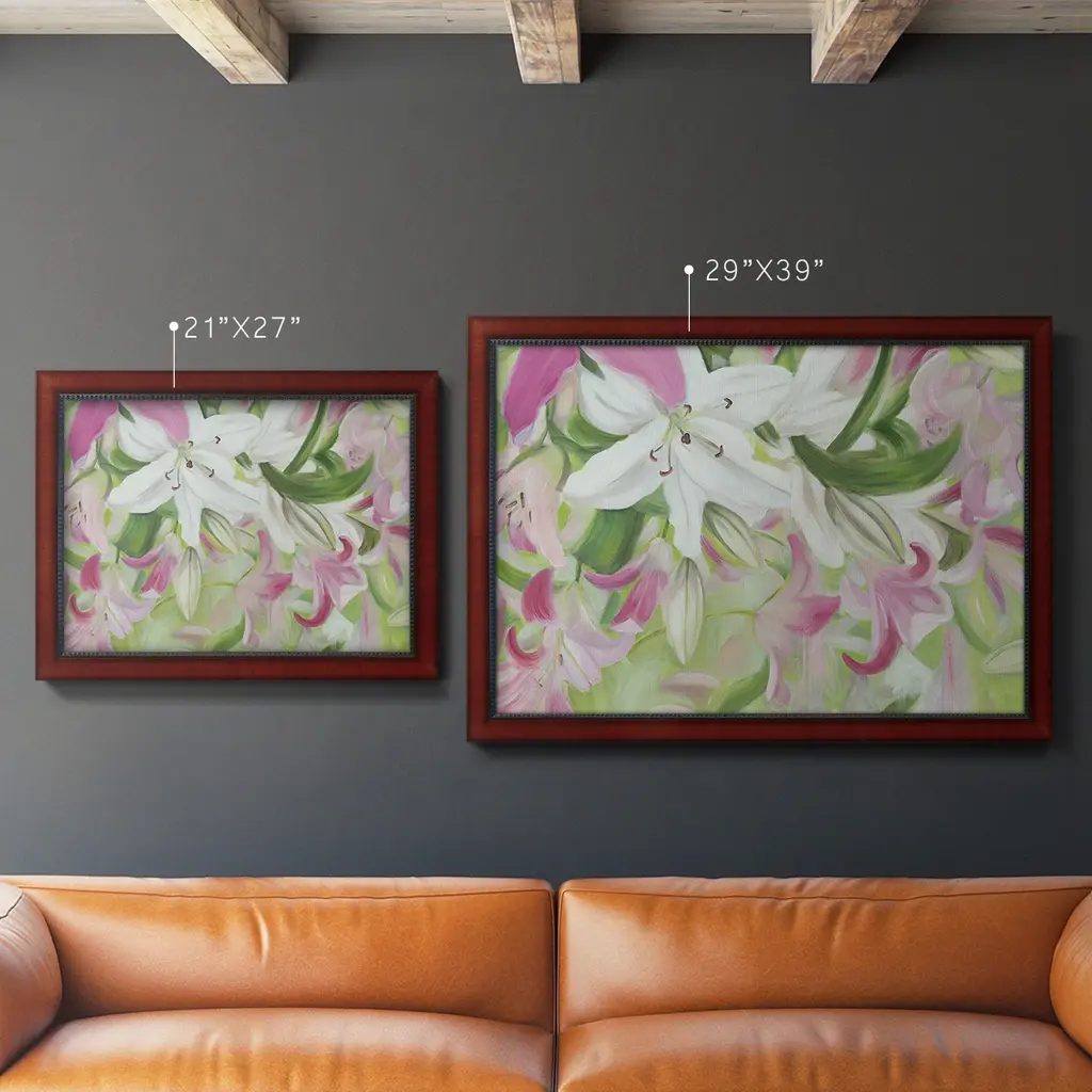 Pink and White Lilies V Premium Framed Canvas- Ready to Hang A Premium Framed Canvas created to last. Framed in distressed wood and available in an array of sizes and colors Featuring a beveled a solid wood stretcher bar, each piece comes ready to hand 3 SIZES AVAILABLE 16''X20'' - Overall Size 18'X27'' - Overall Size 24''x36'' - Overall Size Each piece is made to order. Each piece comes with hanging hardware. Made in the USA Ready to Hang Giclee Paper Print Acrylic Glass Beveled Matt Board