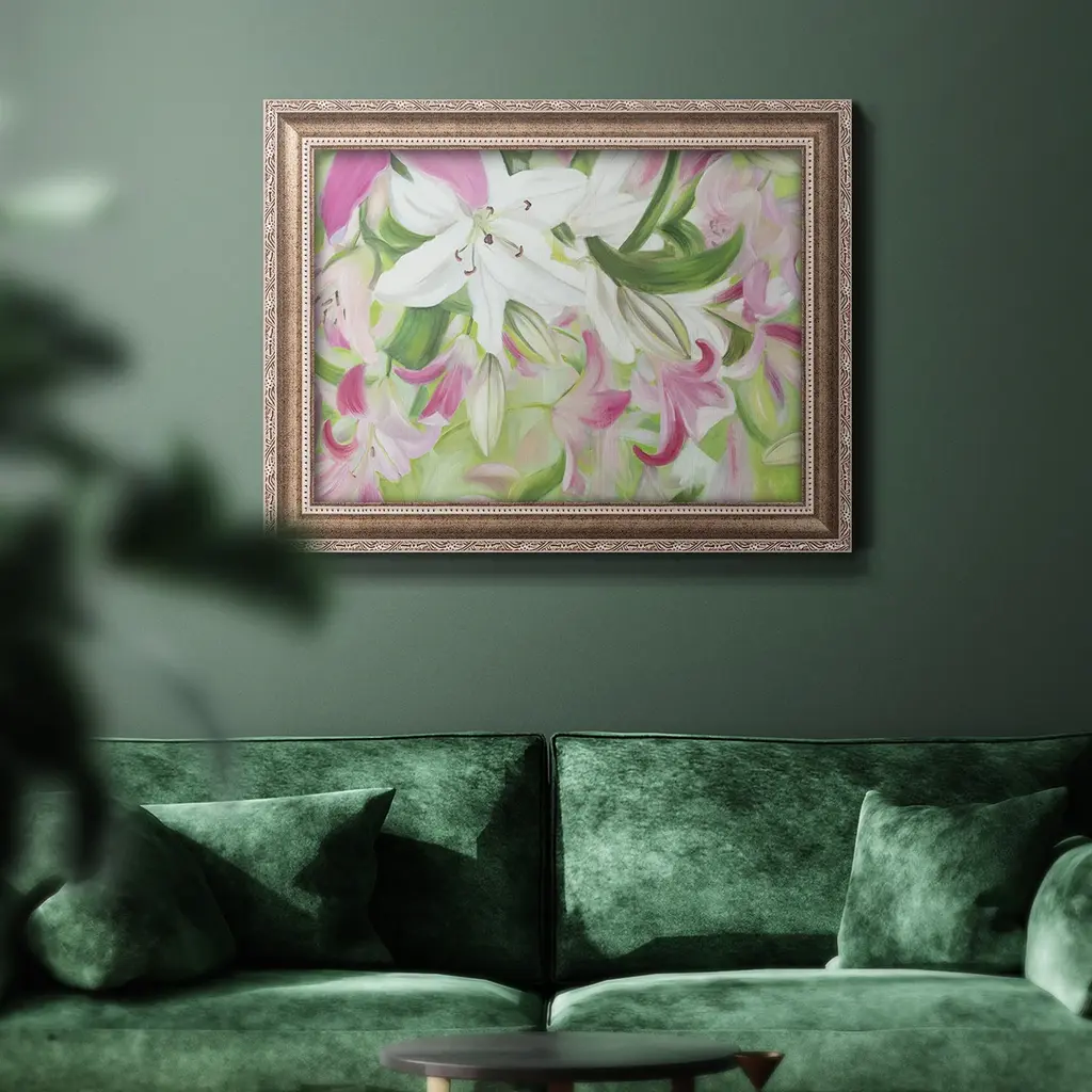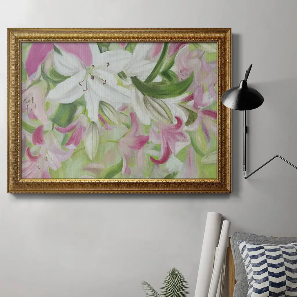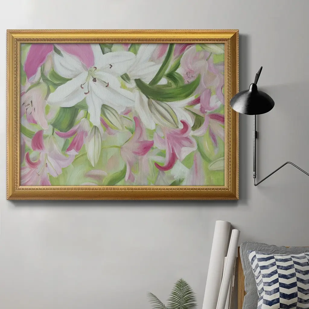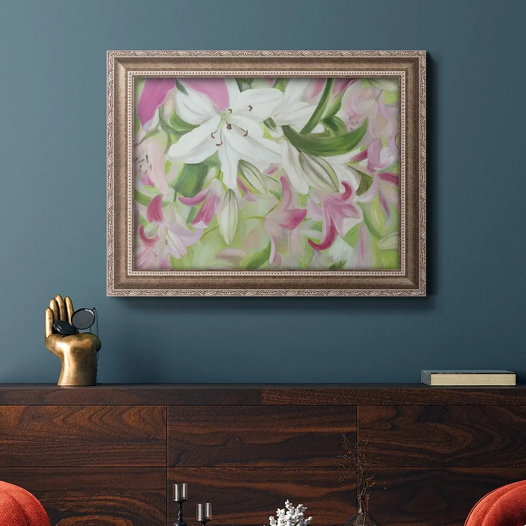 Pink and White Lilies V Premium Framed Canvas- Ready to Hang A Premium Framed Canvas created to last. Framed in distressed wood and available in an array of sizes and colors Featuring a beveled a solid wood stretcher bar, each piece comes ready to hand 3 SIZES AVAILABLE 16''X20'' - Overall Size 18'X27'' - Overall Size 24''x36'' - Overall Size Each piece is made to order. Each piece comes with hanging hardware. Made in the USA Ready to Hang Giclee Paper Print Acrylic Glass Beveled Matt Board