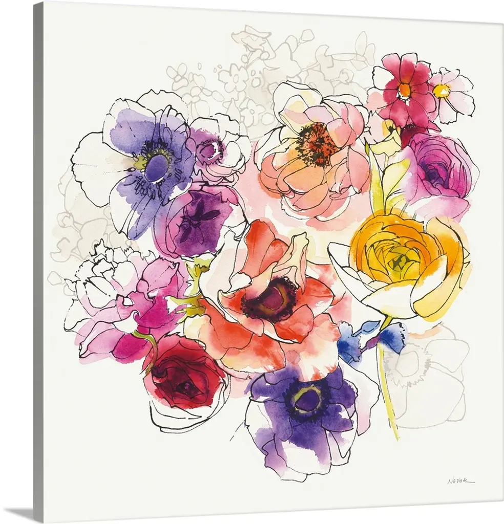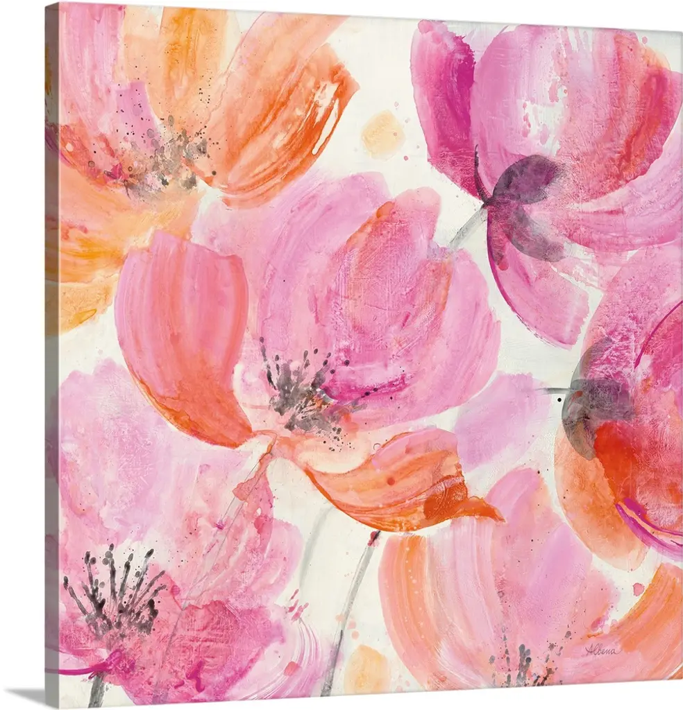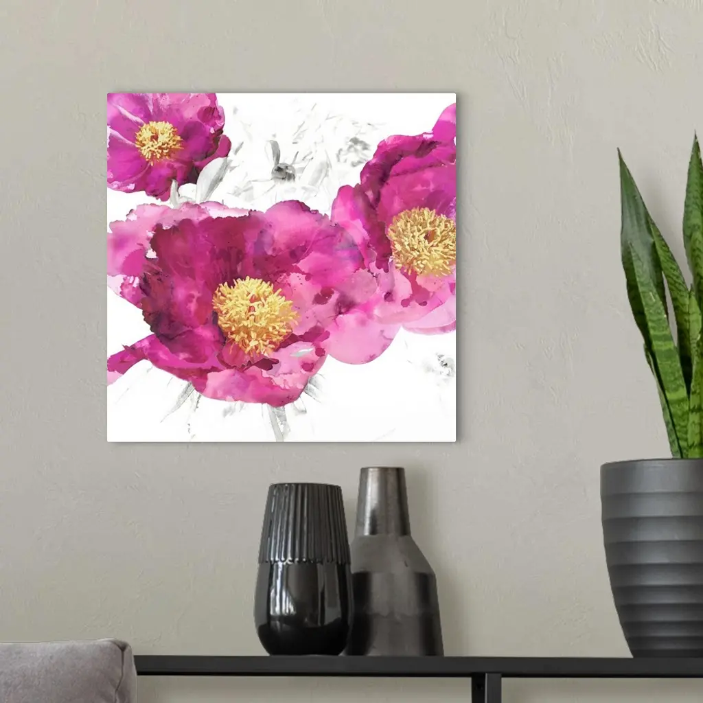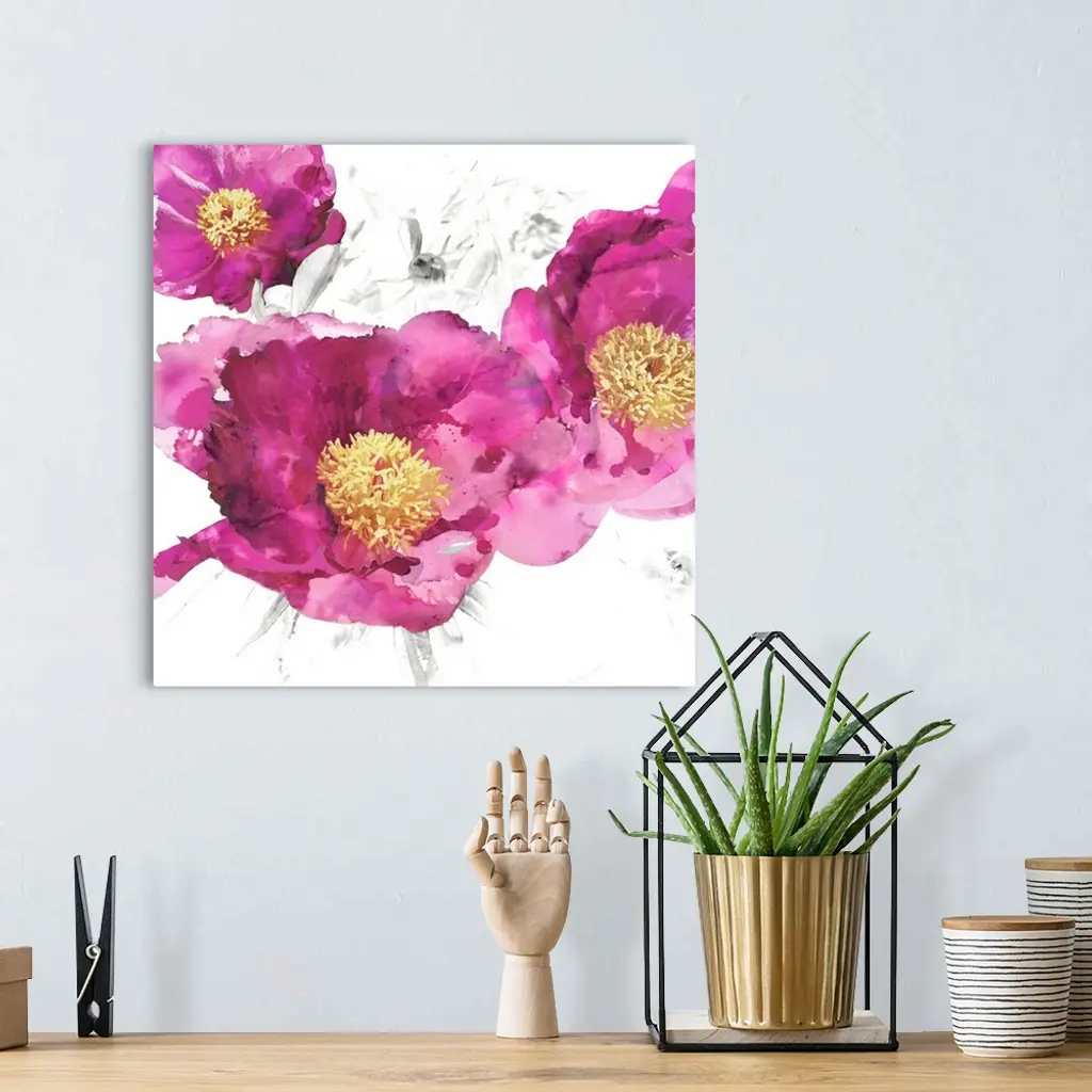 Square decor with bright pink poppies with gold centers on a white background with light sketches.