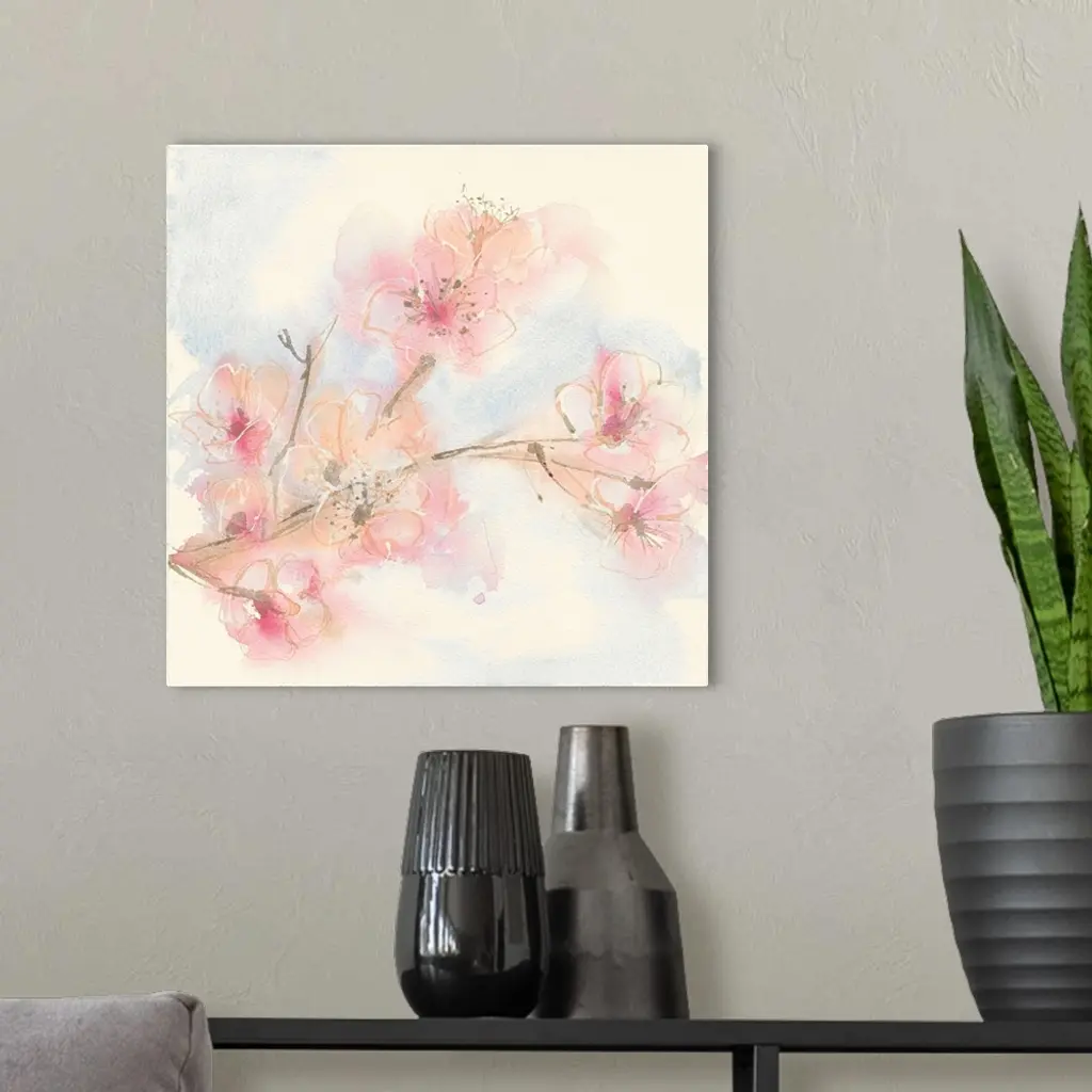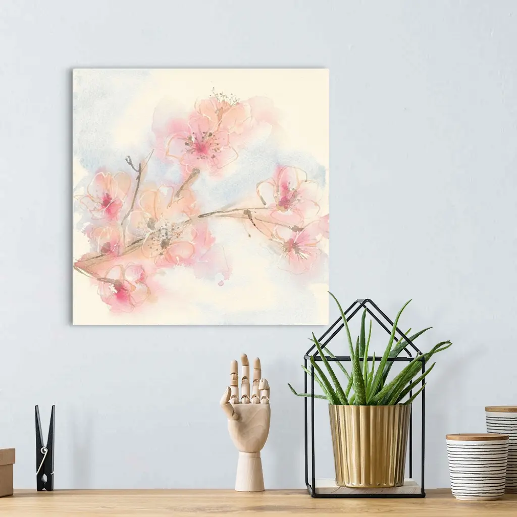 Painting of a branch with pastel pink blooms.