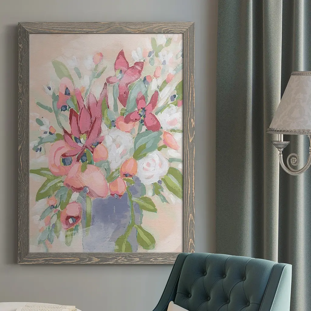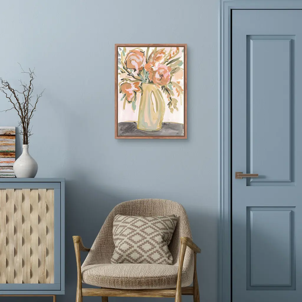A vase bursting with flowers is rendered with lively brushstrokes in pastel hues of pink, green, and gold in this canvas wall art. Botanicals fill the frame with abstract, impressionistic vigor that adds a joyful vibe to living rooms and bedrooms, and it's a vibrant addition to boho gallery walls. Ready to hang in a lightweight taupe frame, it's a buoyant and versatile way to tie the room together.