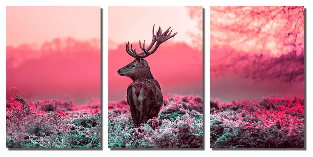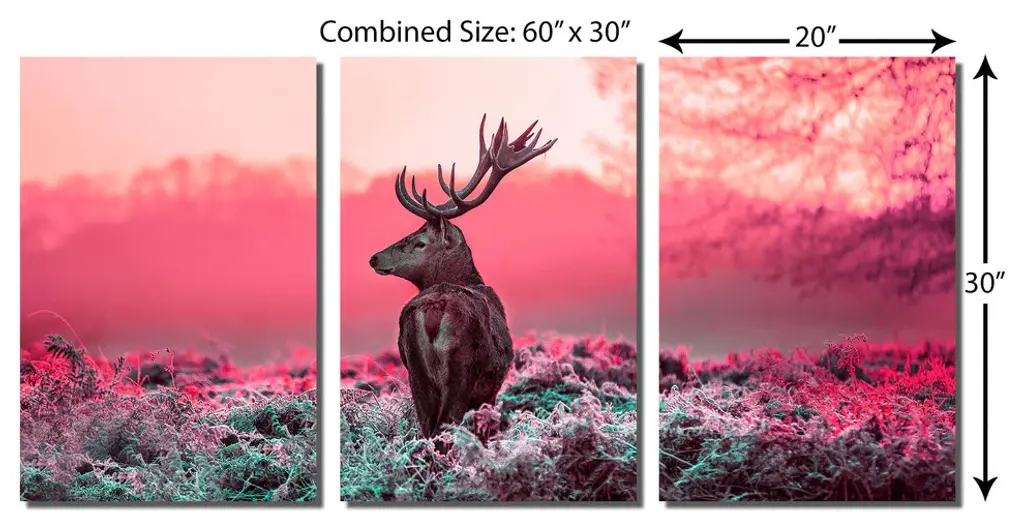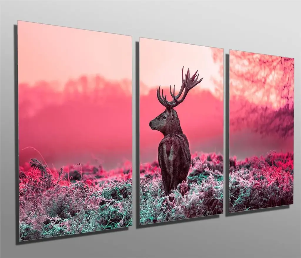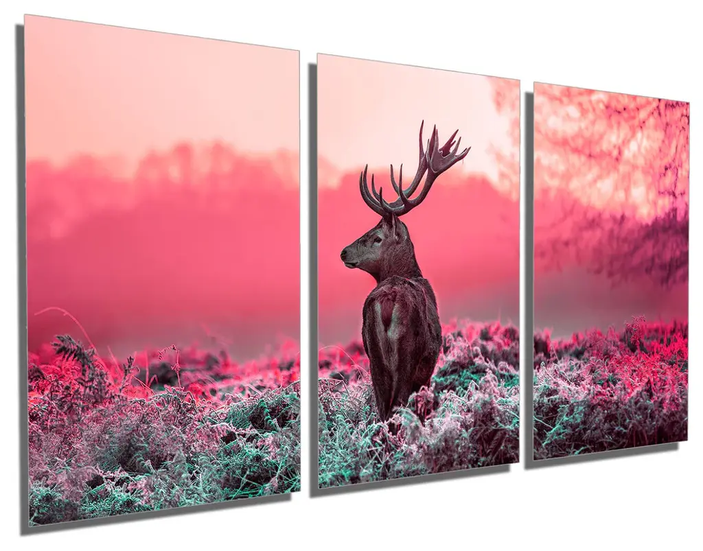 60"œ x 30"œ total size. Ready To Hang! (3 pieces - 20"œ x 30"œ each). 3 Panel Split (Triptych) Metal Print of deer in morning sun pink haze. Modern metal wall art for home or office wall decor & interior design. Printed on Luxurious, HD aluminum glossy metal panels. Multi panel art.. HD aluminum panels. Metal print wall art. Includes Shadow Wall Mount on the back.• Aluminum Metal Wall Art• Made in USA• Ready to hang - No assembly required• Shadow mount hardware on the back• 0.045"œ thick HD Aluminum Panels• Scratch resistant, glossy finish• Superb color clarity, luxurious prints• Epson printing process• For indoor or moisture rich environment use• Easy to clean. Gently wipe with microfiber cloth.