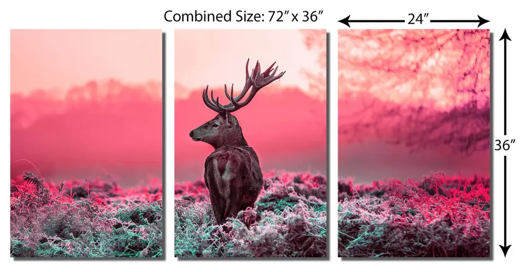72"œ x 36"œ total size. Ready To Hang! (3 pieces - 24"œ x 36"œ each). 3 Panel Split (Triptych) Metal Print of deer in morning sun pink haze. Modern metal wall art for home or office wall decor & interior design. Printed on Luxurious, HD aluminum glossy metal panels. Multi panel art.. HD aluminum panels. Metal print wall art. Includes Shadow Wall Mount on the back.• Aluminum Metal Wall Art• Made in USA• Ready to hang - No assembly required• Shadow mount hardware on the back• 0.045"œ thick HD Aluminum Panels• Scratch resistant, glossy finish• Superb color clarity, luxurious prints• Epson printing process• For indoor or moisture rich environment use• Easy to clean. Gently wipe with microfiber cloth.