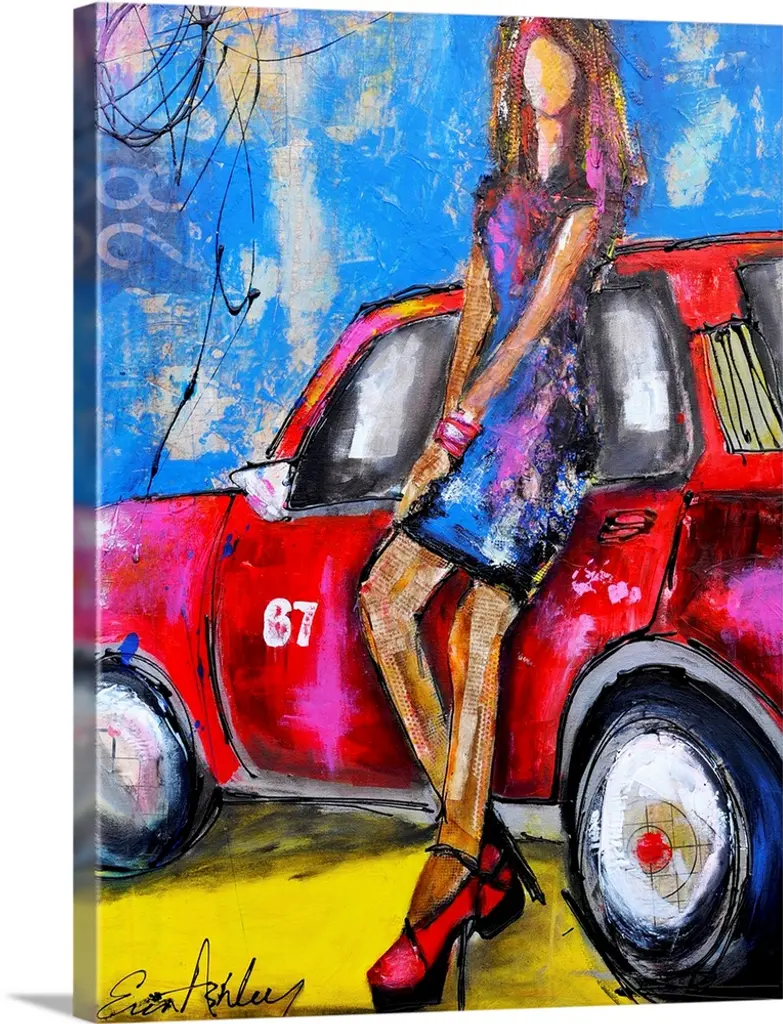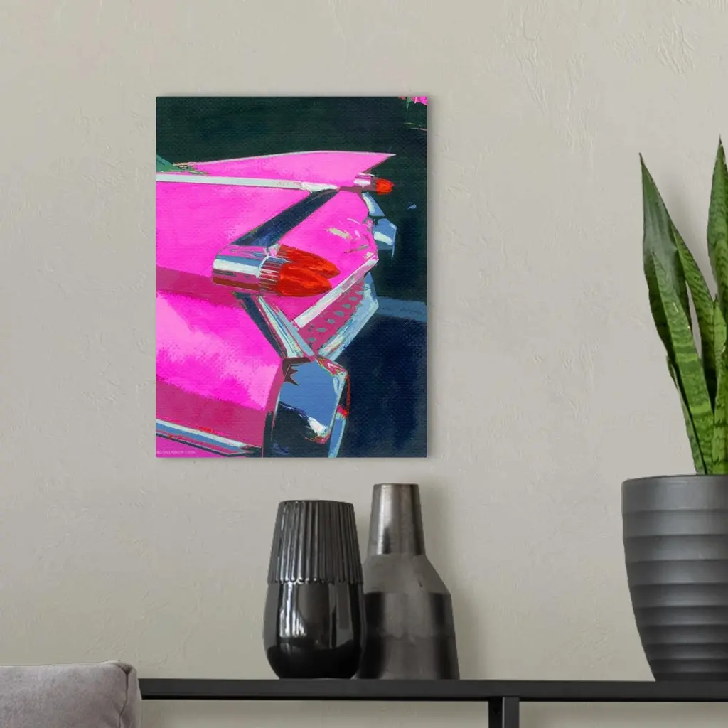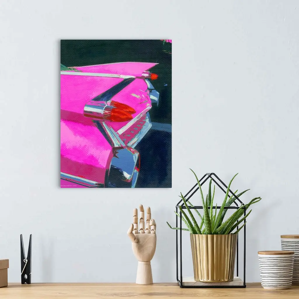 Pink-Fin Painting by RD Randy Riccoboni. An Automotive portrait of a Cadillac in bright Pink offset by blue black chrome and background makes these sexy red tail lights pop off the canvas.