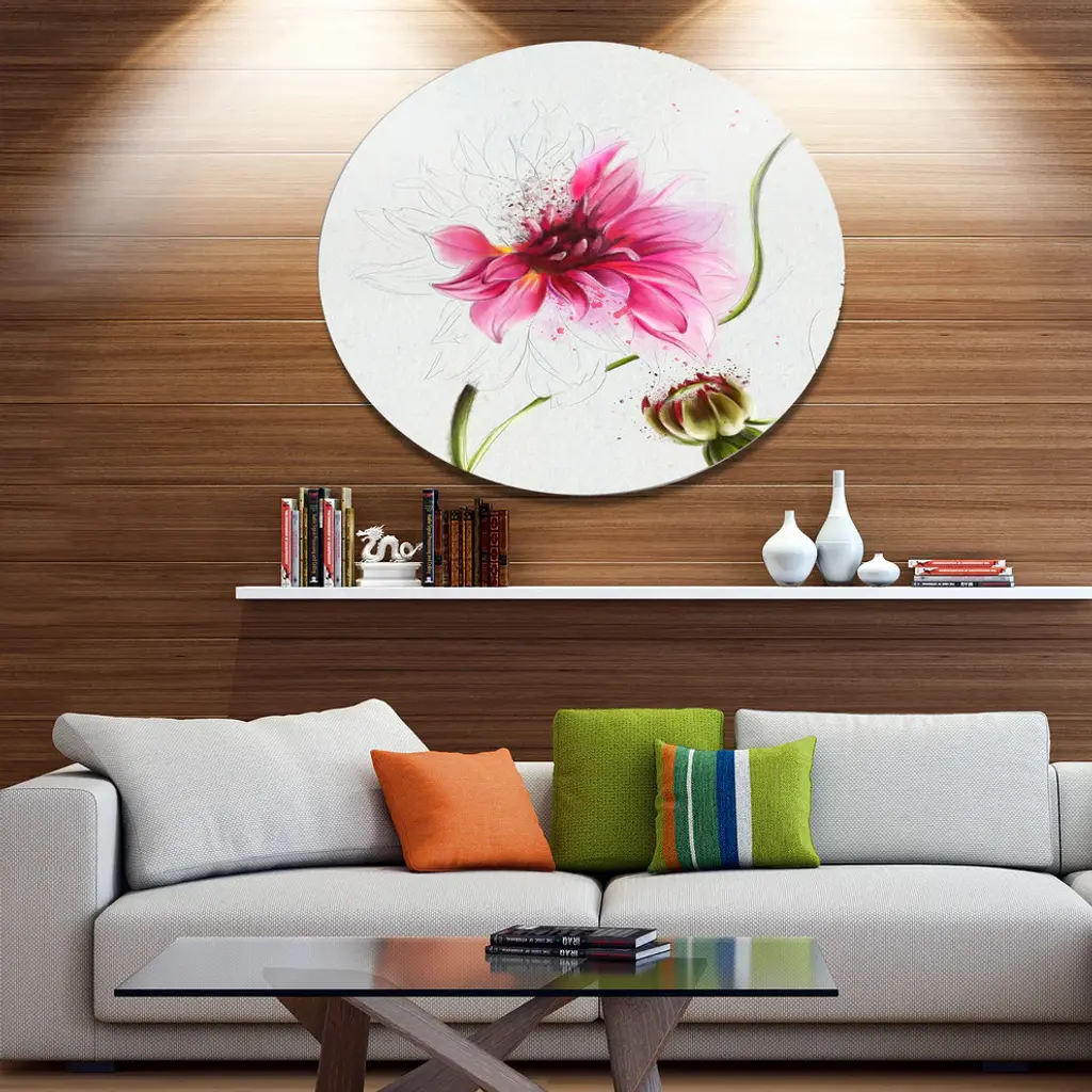 Pink Flower With Stem And Bud, Floral Round Metal Wall Art, 23"