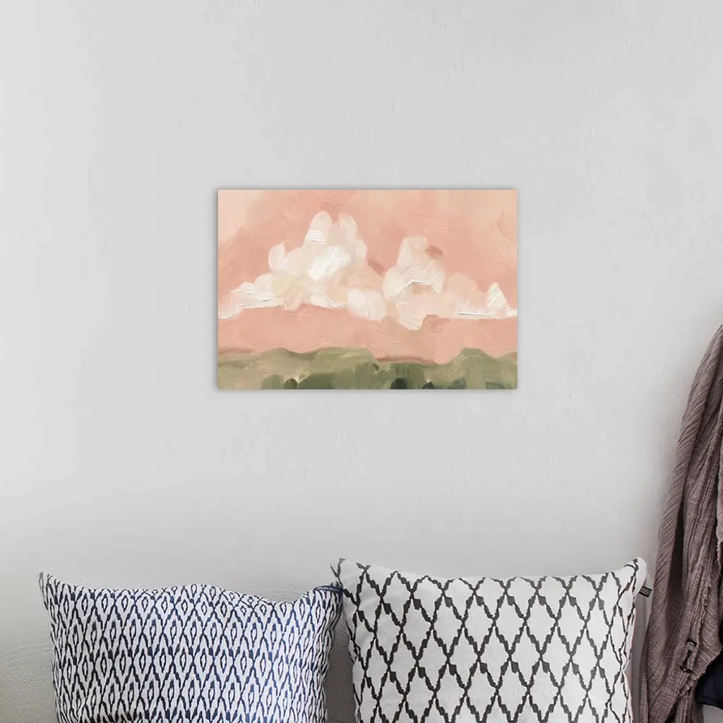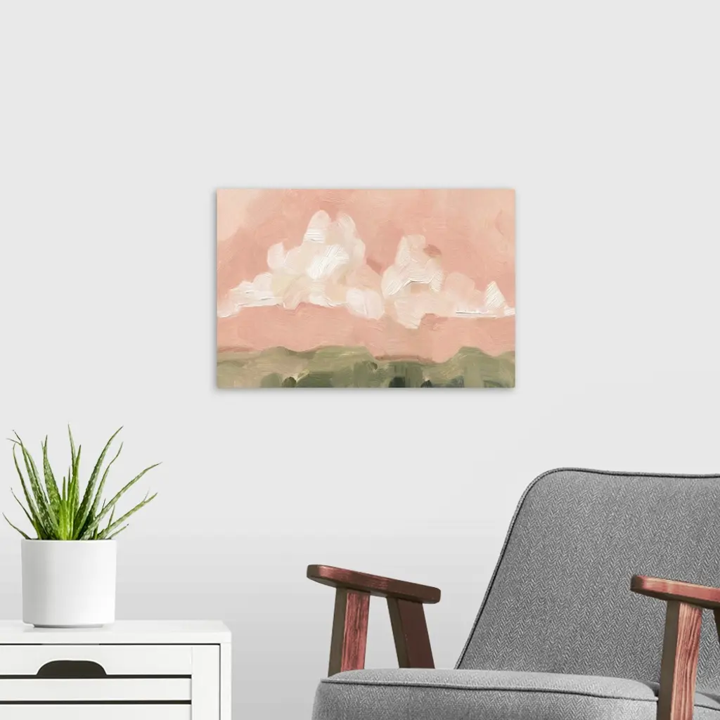 Contemporary painting of bold, textured brush strokes of large white clouds in a pink sky over a field.