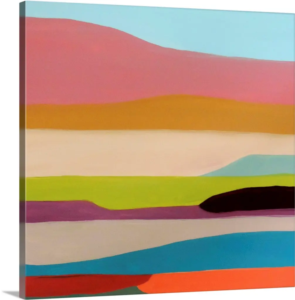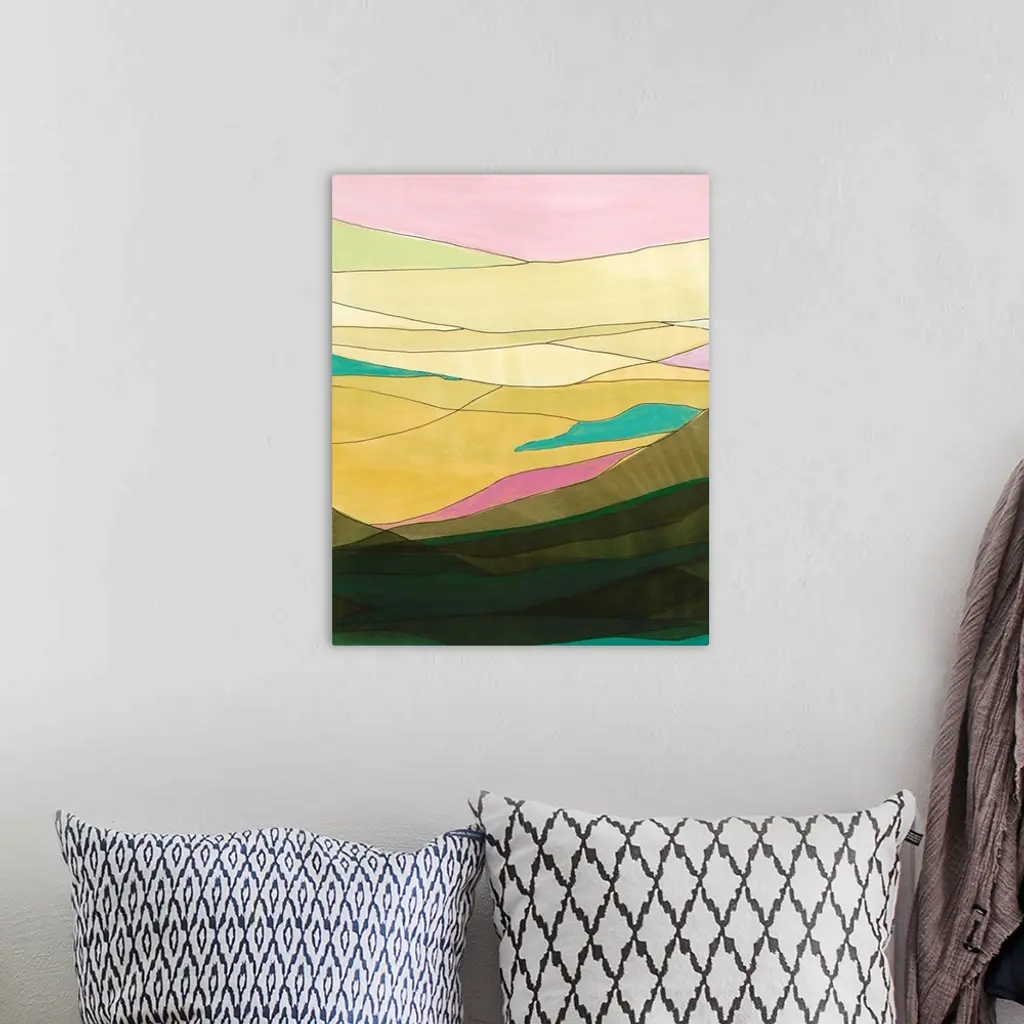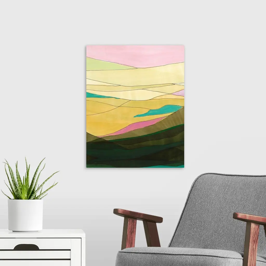 Contemporary abstract painting resembling a mountainous valley made of different color sheets.