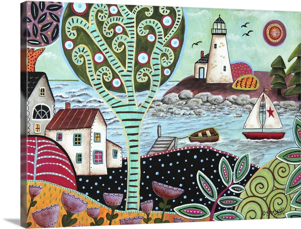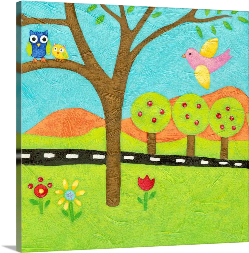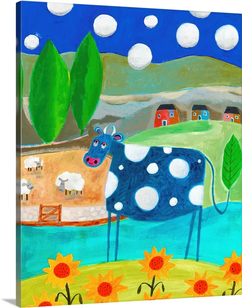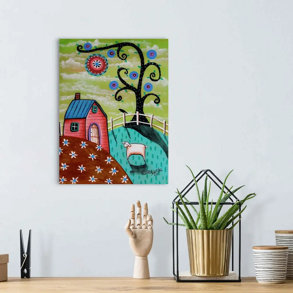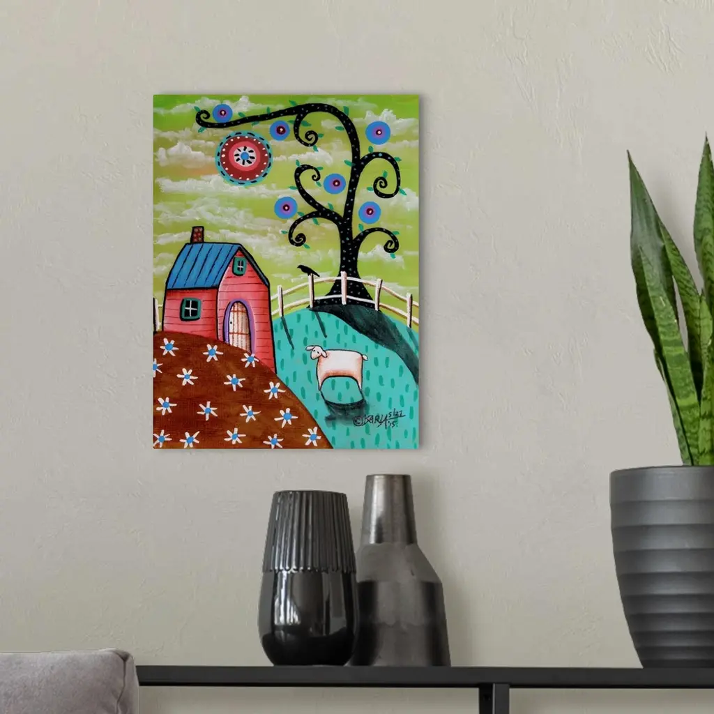 Contemporary folk-art style painting of a rolling hill landscape with houses and patchwork fields.