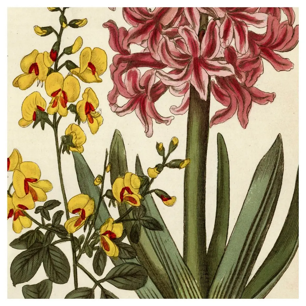 A giclée reproduction of a botanical illustration from 1810. Printed in archival inks, this piece comes beautifully framed in black wood molding with diagonal beaded detailing.