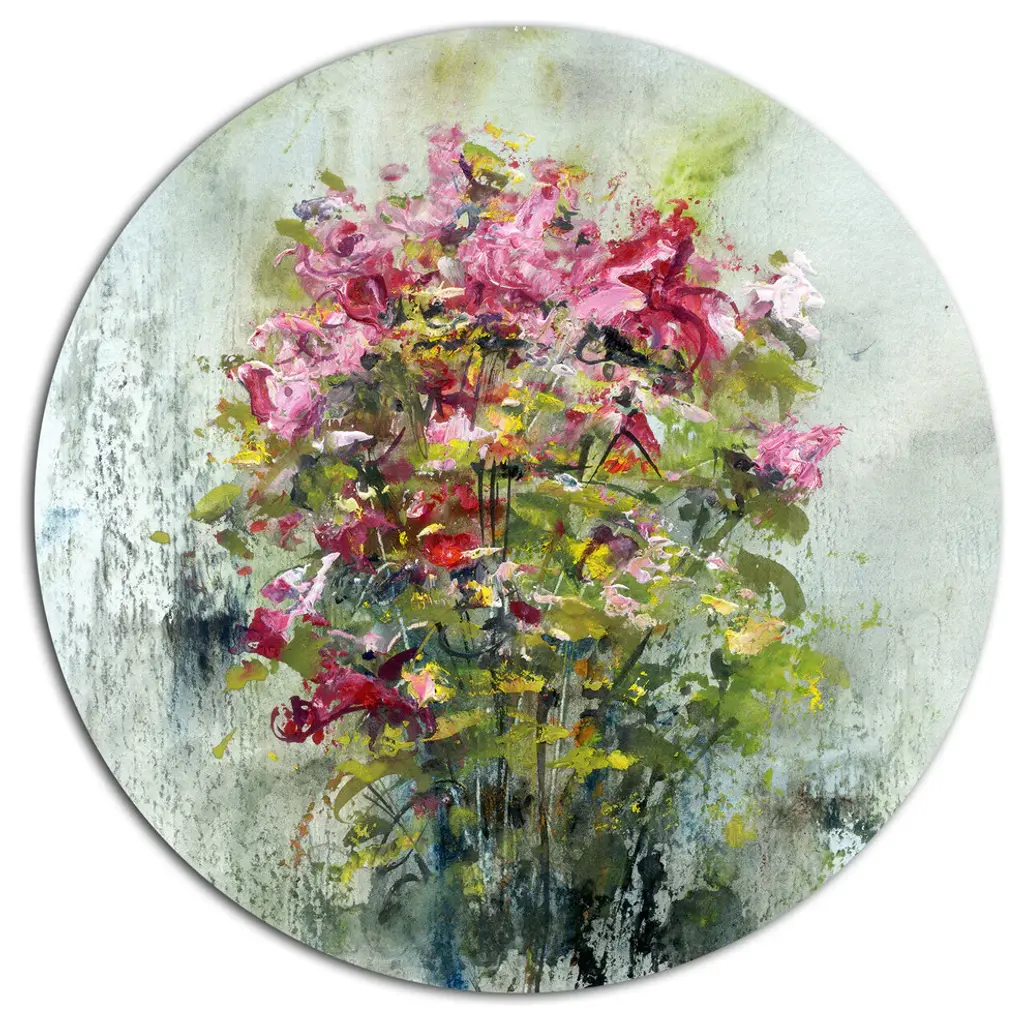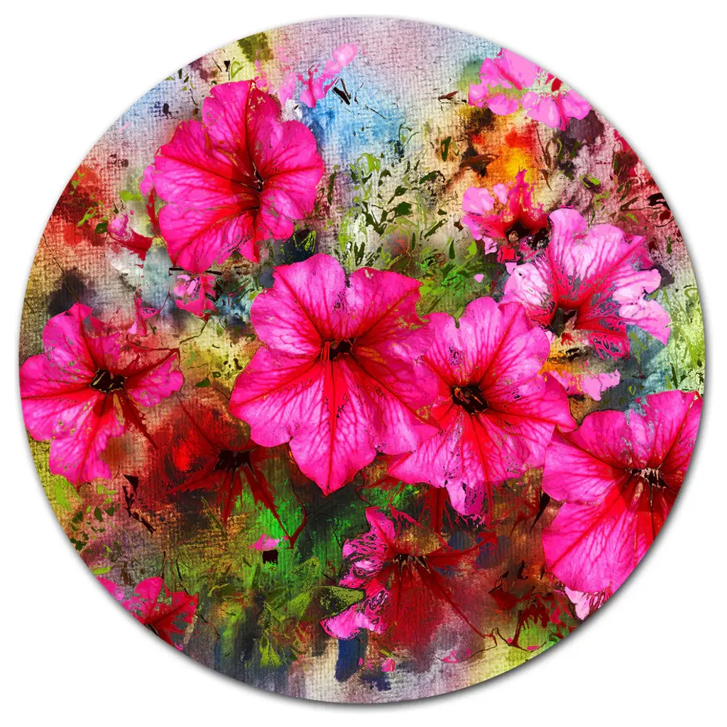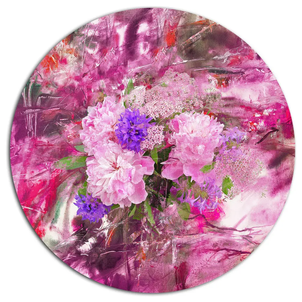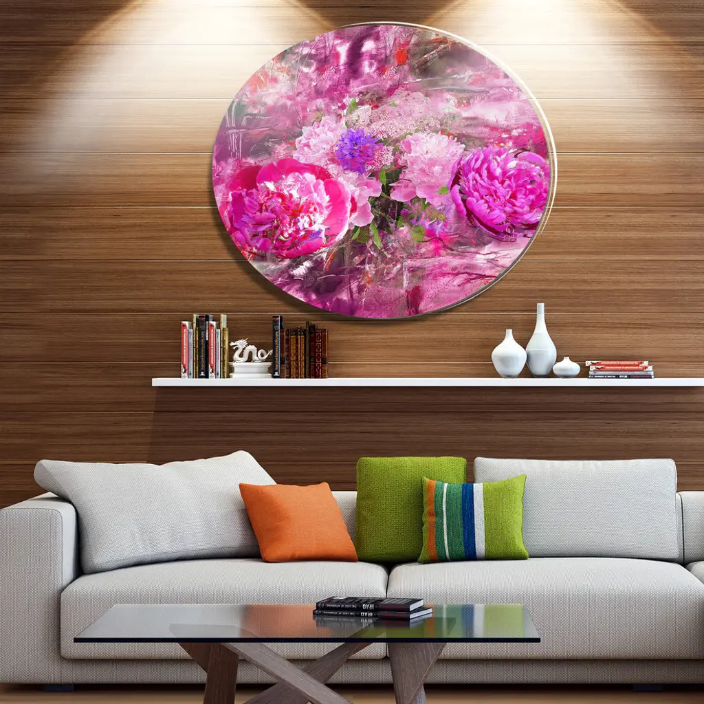 Bring Contemporary Abstraction to your home with this large Circle Metal wall art. This Pink Peonies Abstract Background Metal Artwork makes it the focal point of any room or office. - White Gloss Coating ensures colors are extra vibrant with light reflection.- Aluminum grade Sheet Metal with 1 inch mounting frame on the back giving the illusion that the artwork is floating on the wall..- Mounting Brackets are included along with instructions.- High Quality Digital images are created directly into a glossy aluminum panel producing a stunning and captivating print into the glossy finish of the metal.- Water, Fire and Scratch resistant HD Aluminum panels.- Looks better than any photo paper and guaranteed to last at least 20 years- Easy to clean with a microfiber cloth. Colors are far superior to regular Canvas Art. - Easy to Hang