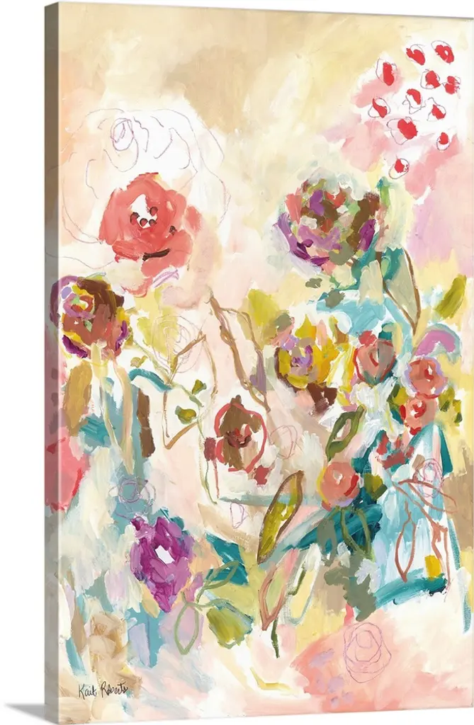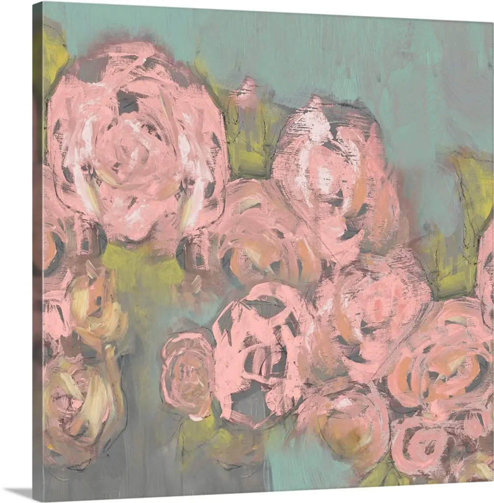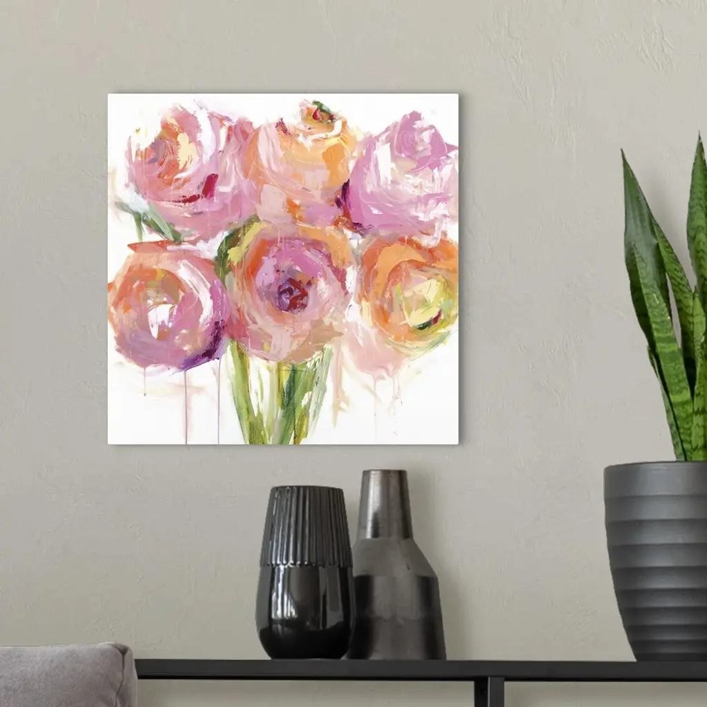 Square painting of large peony blooms in bright shades of pink, orange, white and red.