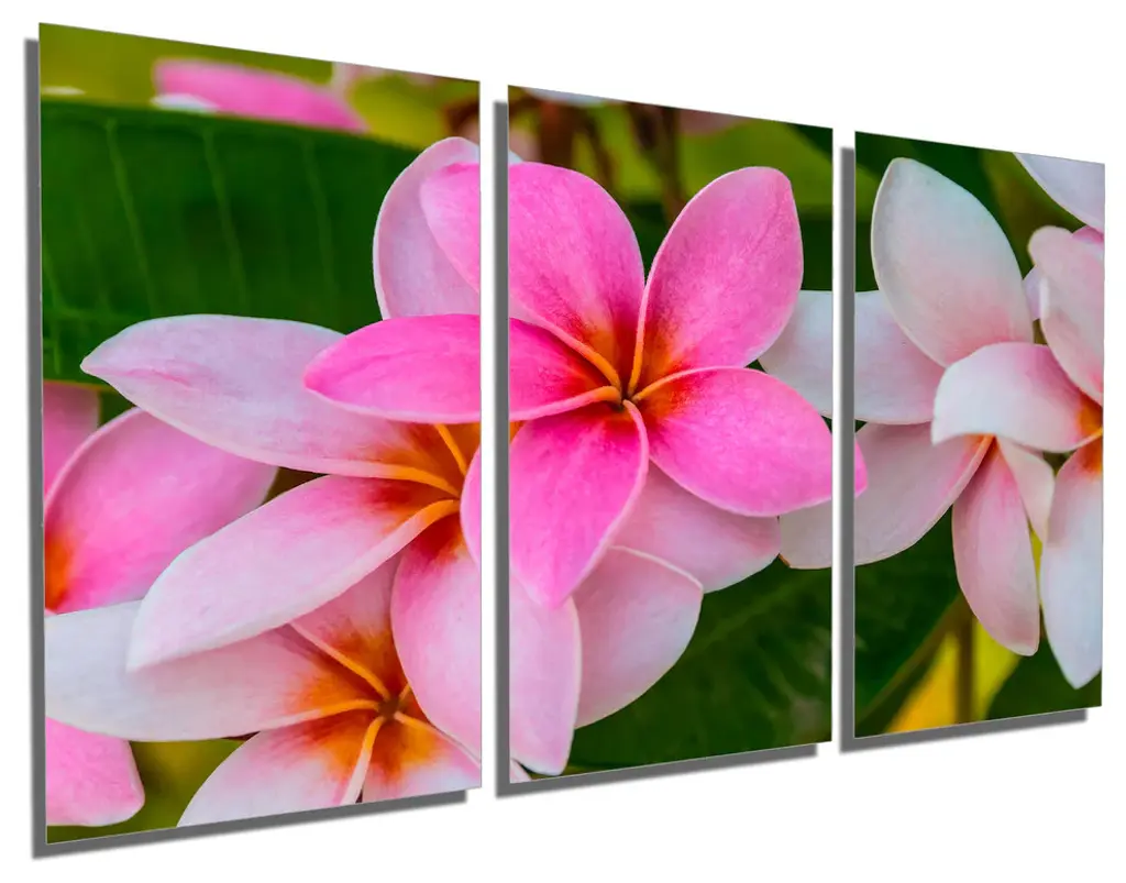 72"œ x 36"œ total size. Ready To Hang! (3 pieces - 24"œ x 36"œ each). 3 Panel Split (Triptych) Metal Print of Pink Plumeria Flowers. Modern metal wall art for home or office wall decor & interior design. Printed on Luxurious, HD aluminum glossy metal panels. Multi panel art.. HD aluminum panels. Metal print wall art. Includes Shadow Wall Mount on the back.• Aluminum Metal Wall Art• Made in USA• Ready to hang - No assembly required• Shadow mount hardware on the back• 0.045"œ thick HD Aluminum Panels• Scratch resistant, glossy finish• Superb color clarity, luxurious prints• Epson printing process• For indoor or moisture rich environment use• Easy to clean. Gently wipe with microfiber cloth.