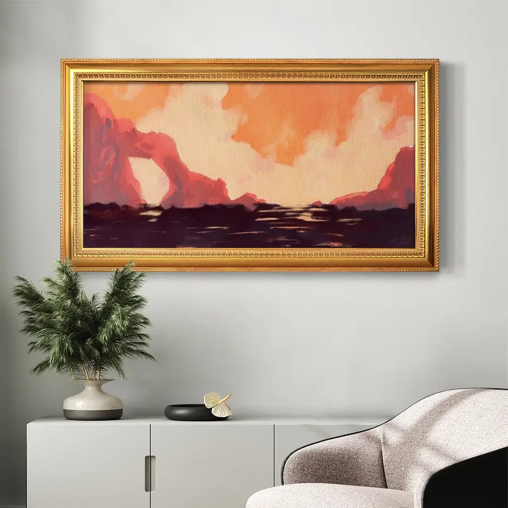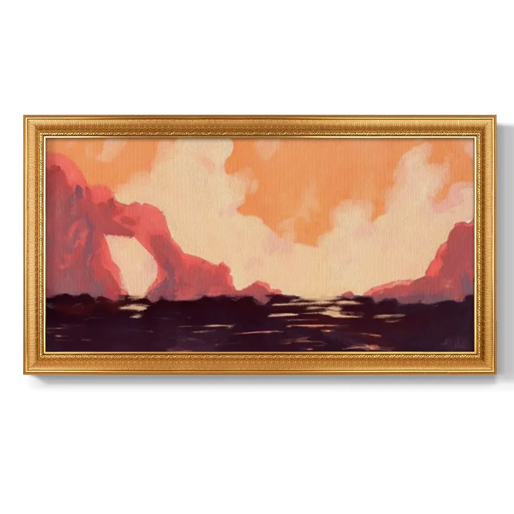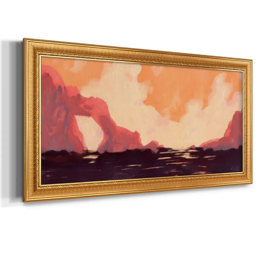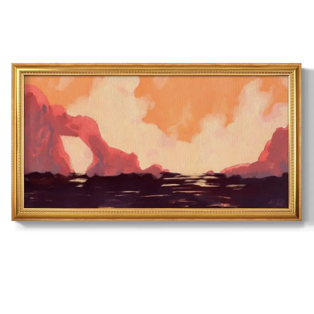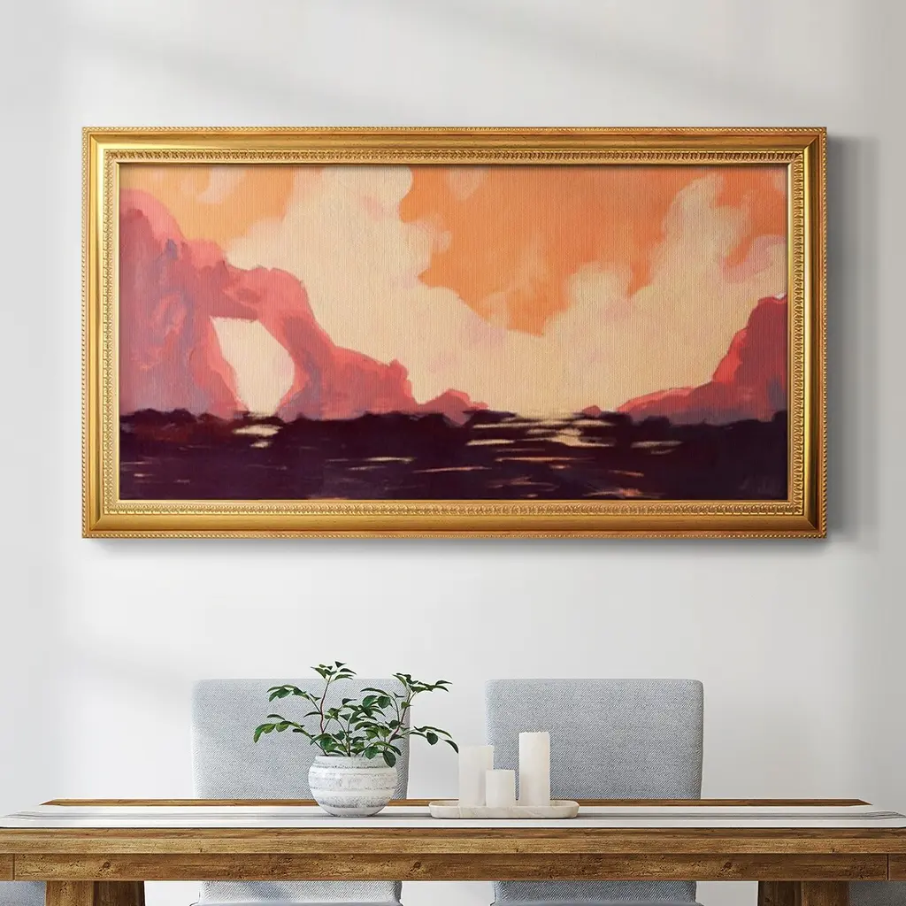 Pink Rock Coast I Premium Framed Canvas- Ready to Hang A Premium Framed Canvas created to last. Framed in distressed wood and available in an array of sizes and colors Featuring a beveled a solid wood stretcher bar, each piece comes ready to hand 3 SIZES AVAILABLE 21''X37'' - Overall Size 25''X45'' - Overall Size 29''x53'' - Overall Size Each piece is made to order. Each piece comes with hanging hardware. Made in the USA Ready to Hang Giclee Paper Print Acrylic Glass Beveled Matt Board