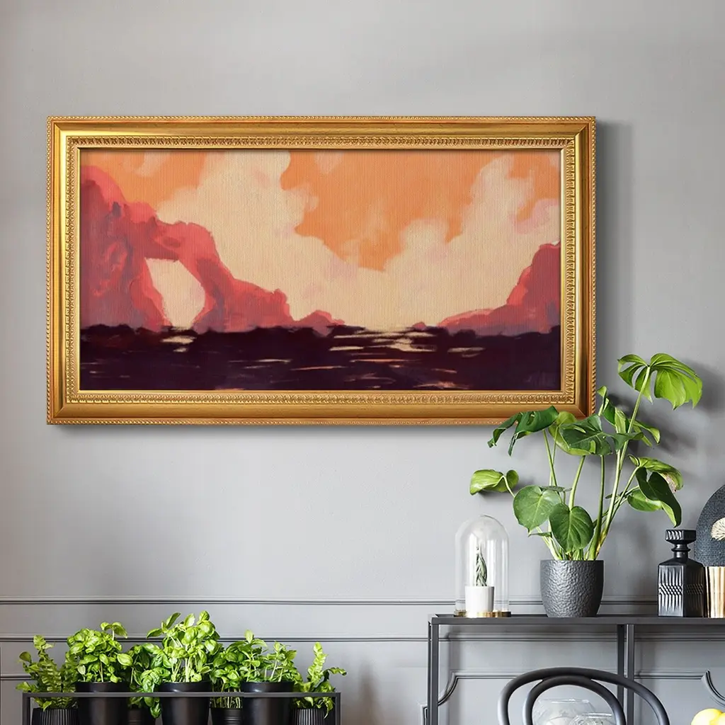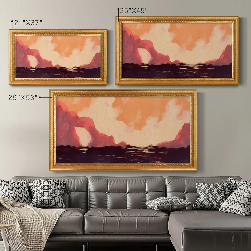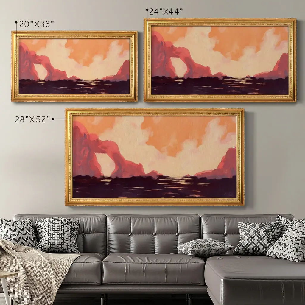 Pink Rock Coast I Premium Framed Canvas- Ready to Hang A Premium Framed Canvas created to last. Framed in distressed wood and available in an array of sizes and colors Featuring a beveled a solid wood stretcher bar, each piece comes ready to hand 3 SIZES AVAILABLE 21''X37'' - Overall Size 25''X45'' - Overall Size 29''x53'' - Overall Size Each piece is made to order. Each piece comes with hanging hardware. Made in the USA Ready to Hang Giclee Paper Print Acrylic Glass Beveled Matt Board