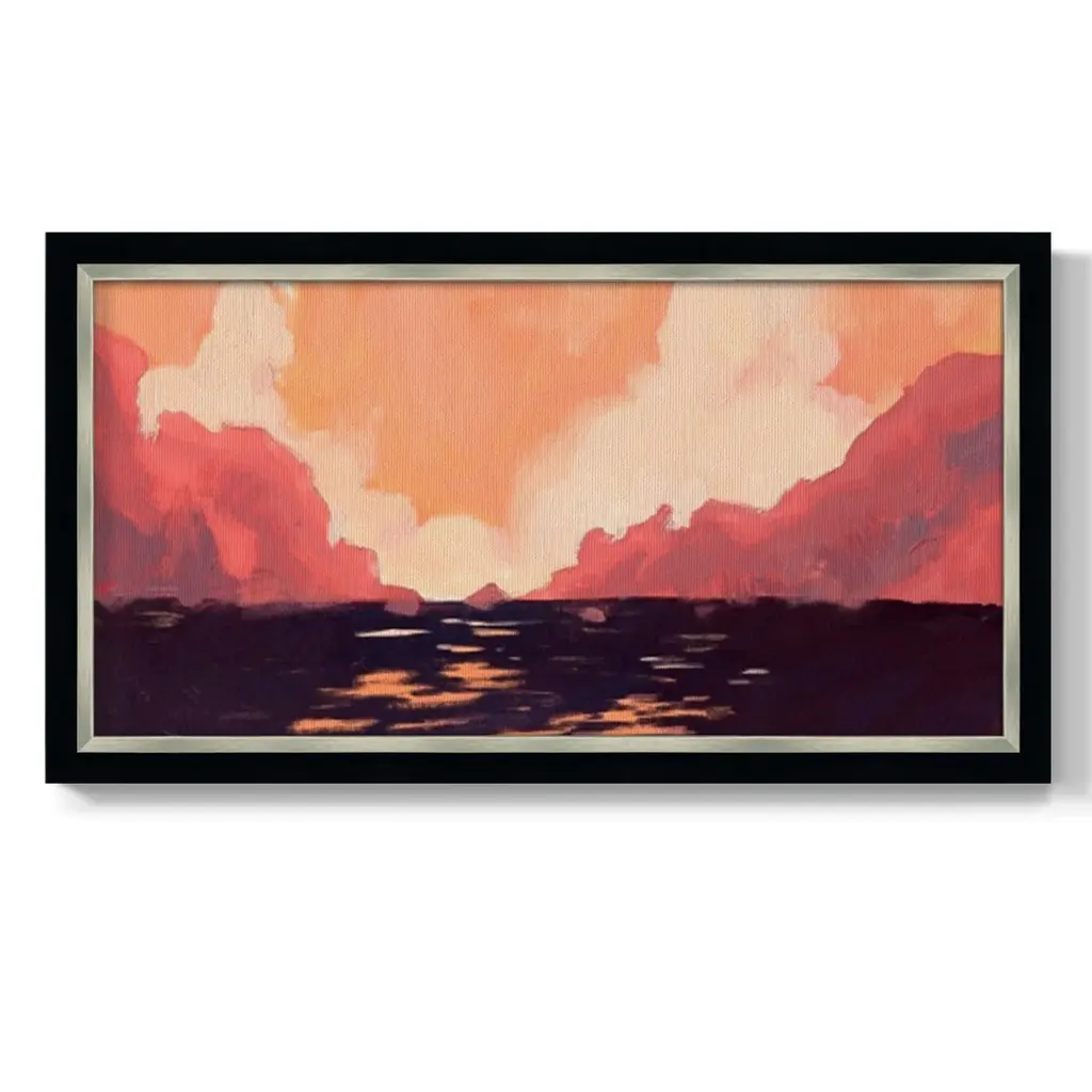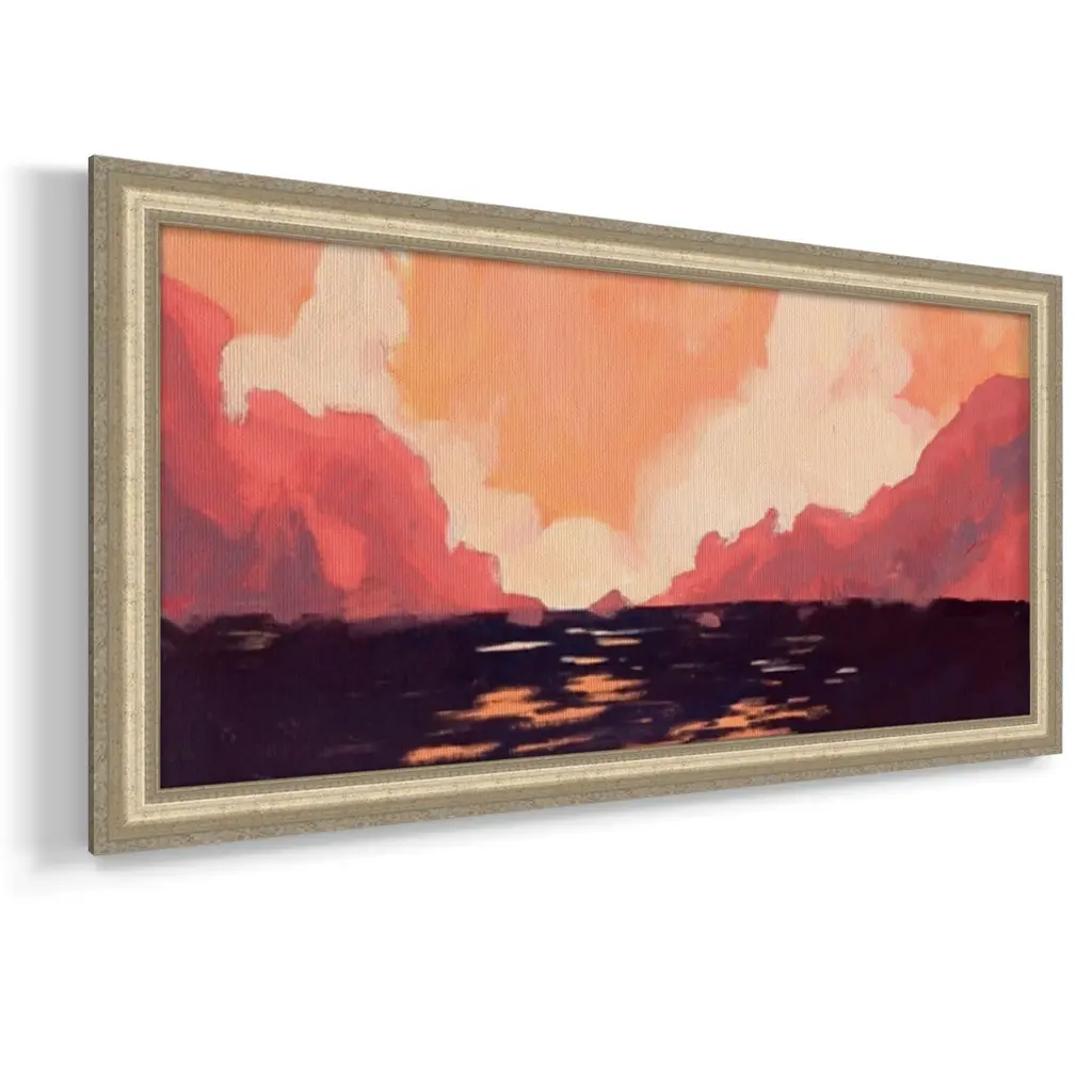 Pink Rock Coast II Premium Framed Canvas- Ready to Hang A Premium Framed Canvas created to last. Framed in distressed wood and available in an array of sizes and colors Featuring a beveled a solid wood stretcher bar, each piece comes ready to hand 3 SIZES AVAILABLE 21''X37'' - Overall Size 25''X45'' - Overall Size 29''x53'' - Overall Size Each piece is made to order. Each piece comes with hanging hardware. Made in the USA Ready to Hang Giclee Paper Print Acrylic Glass Beveled Matt Board