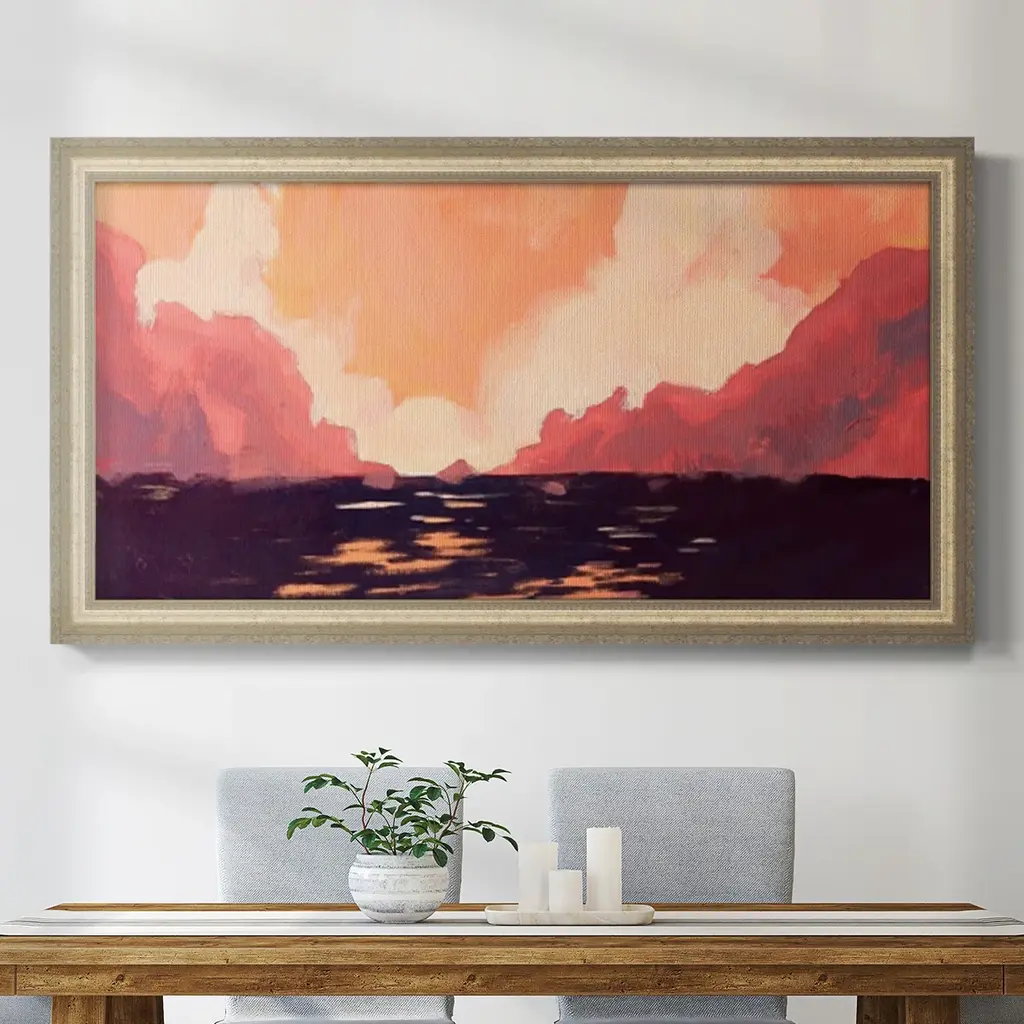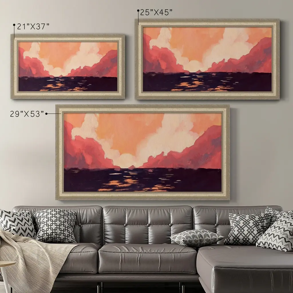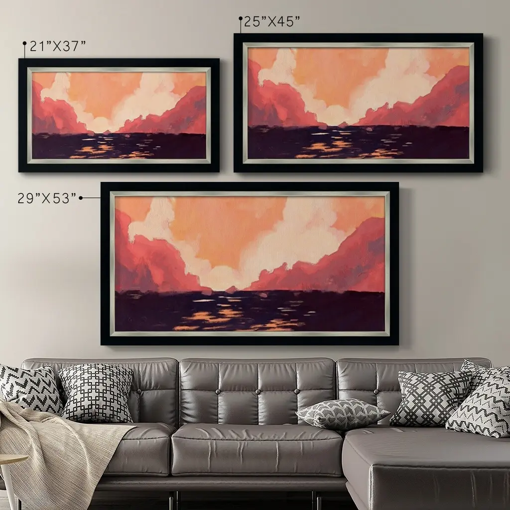 Pink Rock Coast II Premium Framed Canvas- Ready to Hang A Premium Framed Canvas created to last. Framed in distressed wood and available in an array of sizes and colors Featuring a beveled a solid wood stretcher bar, each piece comes ready to hand 3 SIZES AVAILABLE 21''X37'' - Overall Size 25''X45'' - Overall Size 29''x53'' - Overall Size Each piece is made to order. Each piece comes with hanging hardware. Made in the USA Ready to Hang Giclee Paper Print Acrylic Glass Beveled Matt Board