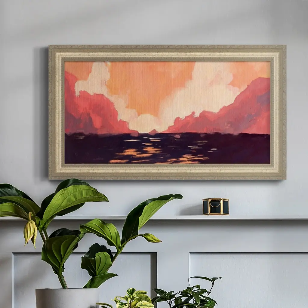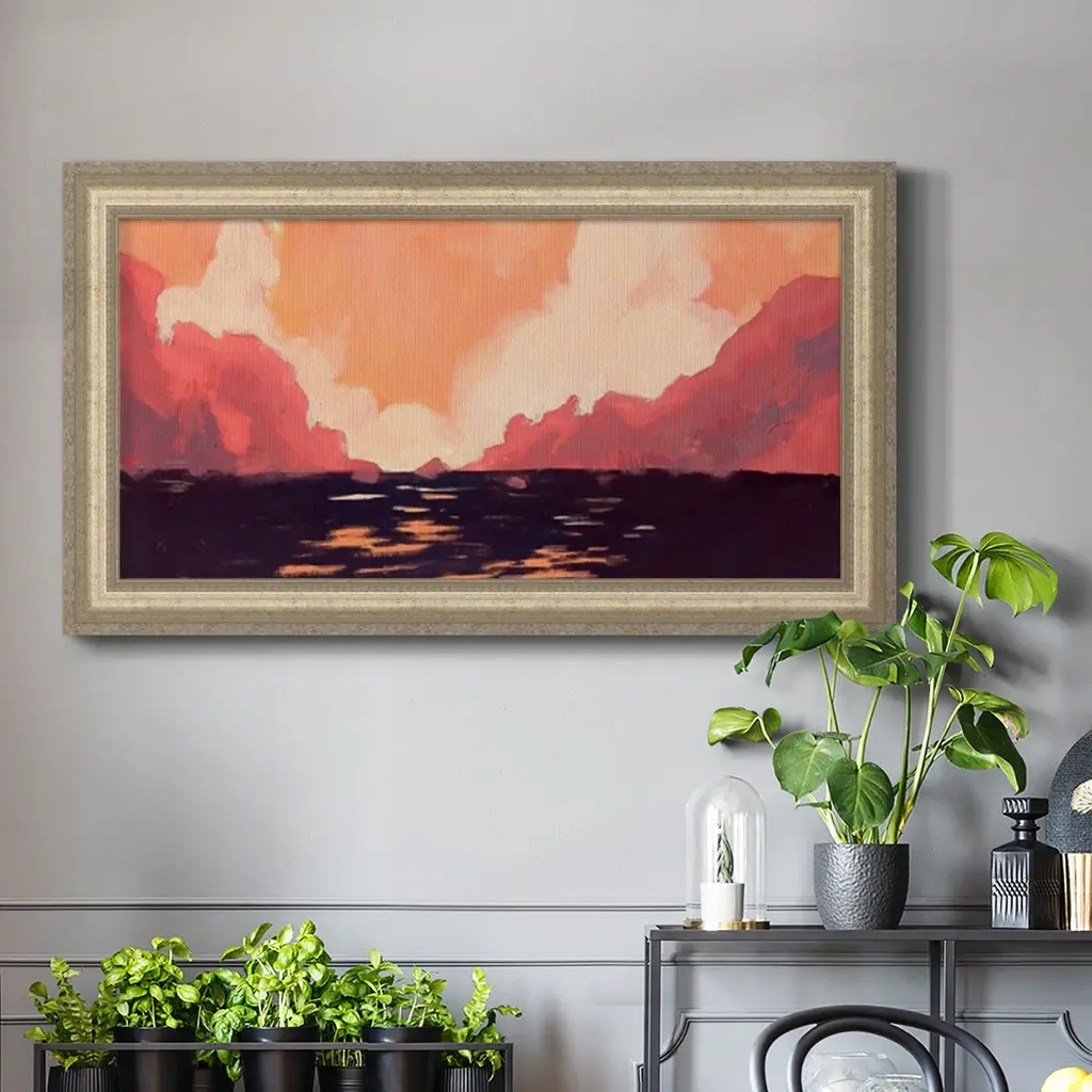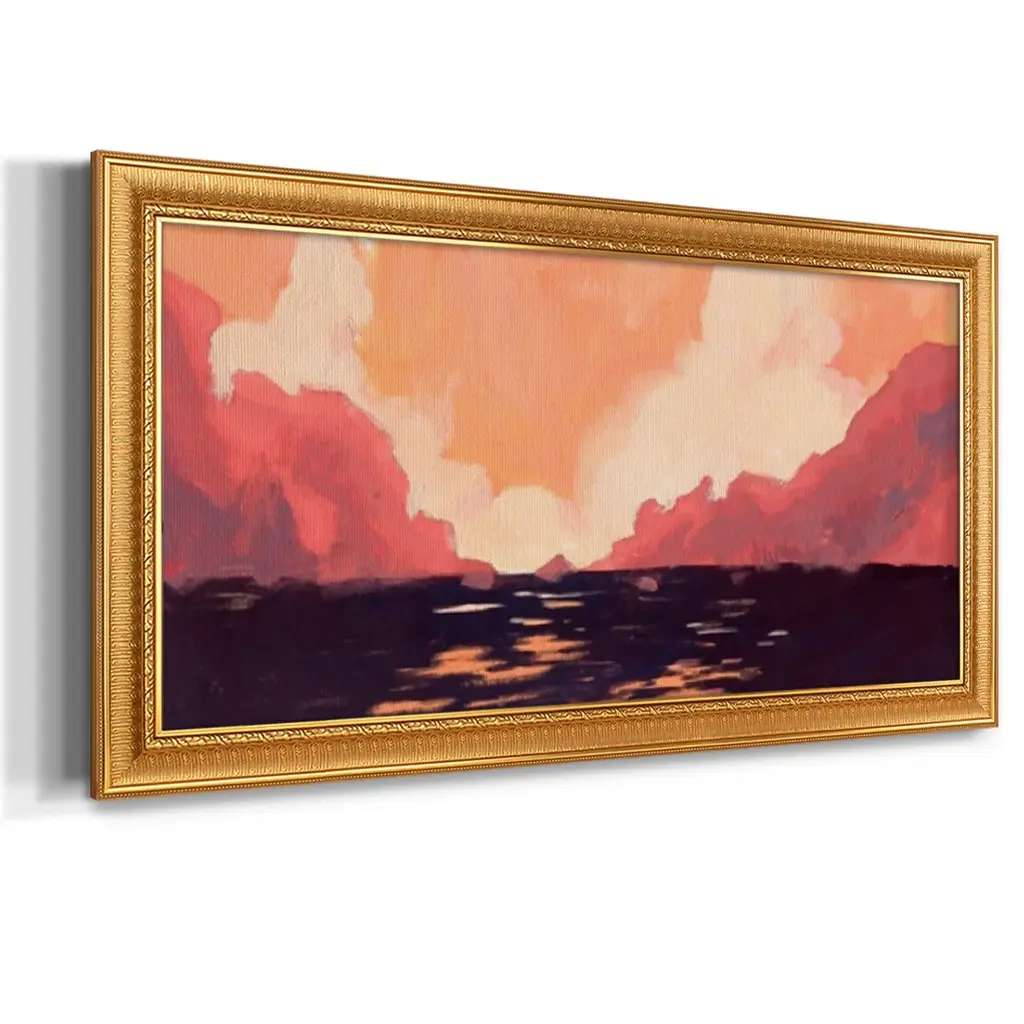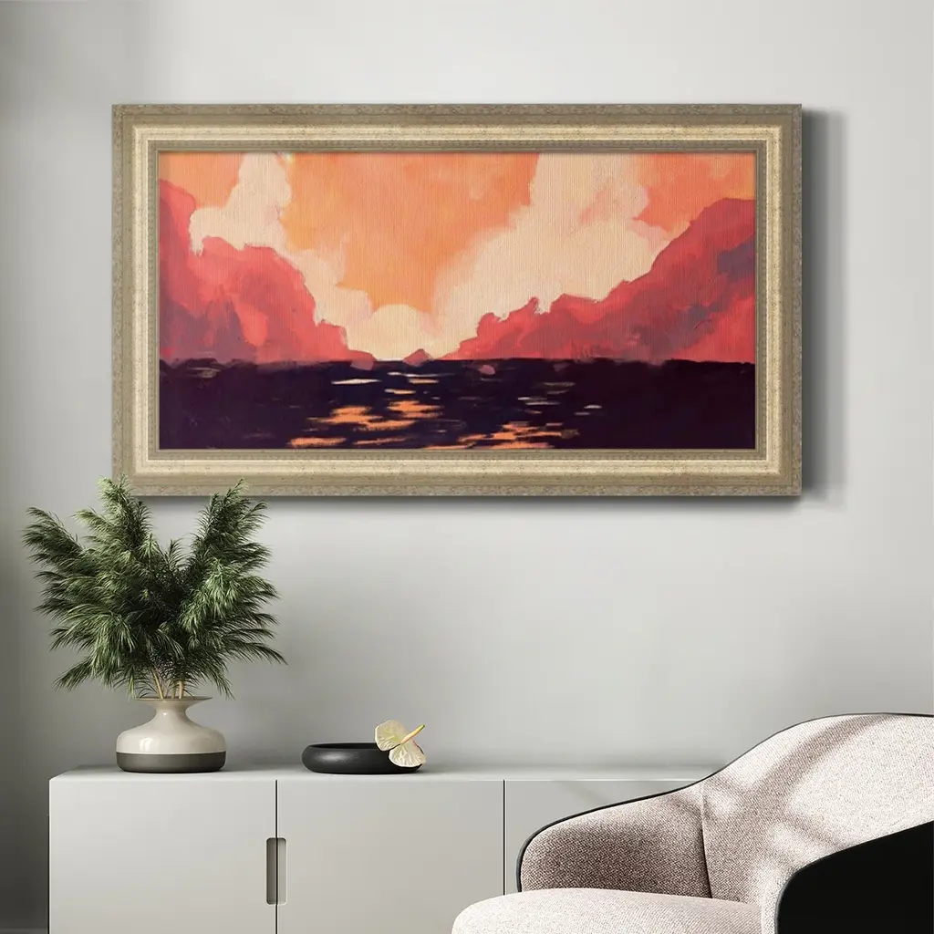 Pink Rock Coast II Premium Framed Canvas- Ready to Hang A Premium Framed Canvas created to last. Framed in distressed wood and available in an array of sizes and colors Featuring a beveled a solid wood stretcher bar, each piece comes ready to hand 3 SIZES AVAILABLE 21''X37'' - Overall Size 25''X45'' - Overall Size 29''x53'' - Overall Size Each piece is made to order. Each piece comes with hanging hardware. Made in the USA Ready to Hang Giclee Paper Print Acrylic Glass Beveled Matt Board