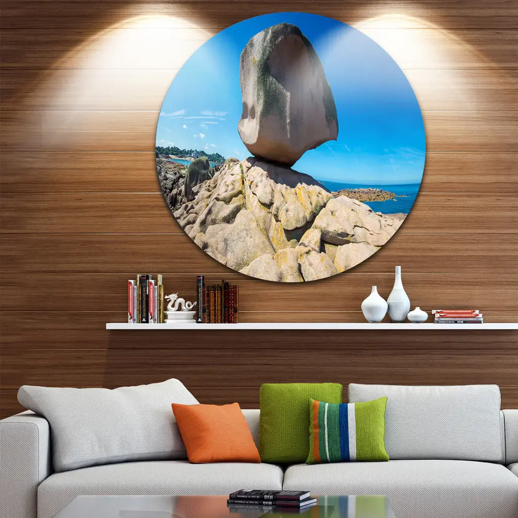 Bring Contemporary Abstraction to your home with this large Circle Metal wall art. This Pink Rock in Tregastel Metal Artwork makes it the focal point of any room or office. - White Gloss Coating ensures colors are extra vibrant with light reflection.- Aluminum grade Sheet Metal with 1 inch mounting frame on the back giving the illusion that the artwork is floating on the wall..- Mounting Brackets are included along with instructions.- High Quality Digital images are created directly into a glossy aluminum panel producing a stunning and captivating print into the glossy finish of the metal.- Water, Fire and Scratch resistant HD Aluminum panels.- Looks better than any photo paper and guaranteed to last at least 20 years- Easy to clean with a microfiber cloth. Colors are far superior to regular Canvas Art. - Easy to Hang