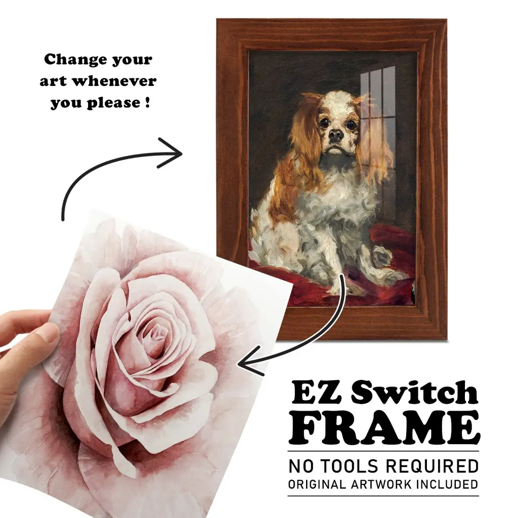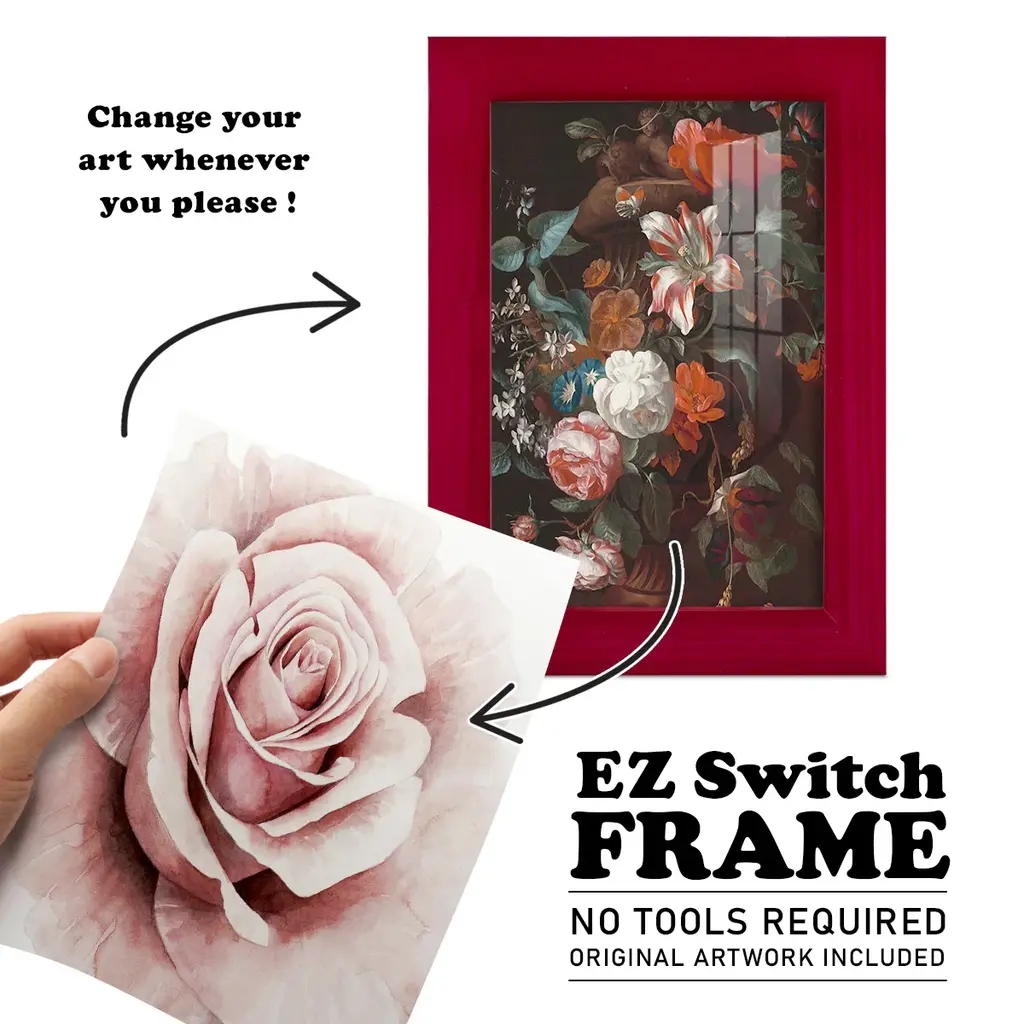 Pink Rose I -EZ SWITCH Framed Print w/glass-Cherry Red A delightful, framed print. Featuring a solid wood frame with real wood glass. This premium print is giclee quality. In addition, every frame features a removable back and table top stand. This allows you to change your art in the future or to just stand the art on a table for a new look. We are sure you'll enjoy our new series of EZ SWITCH Framed Art. Solid Wood Frame Real Glass Removable / Replaceable Art Built in Tabletop Stand Sizes range from 4x6 up to 12x15 - buy just one or pair them up as sets as you see fit.