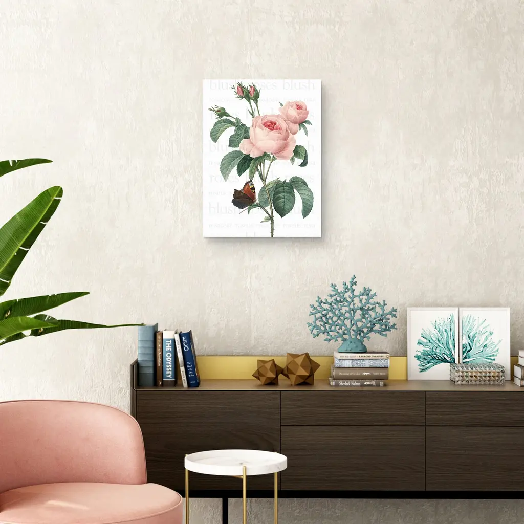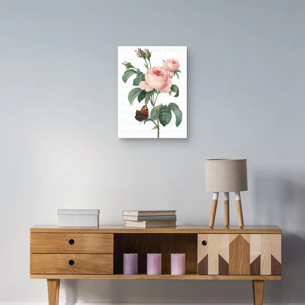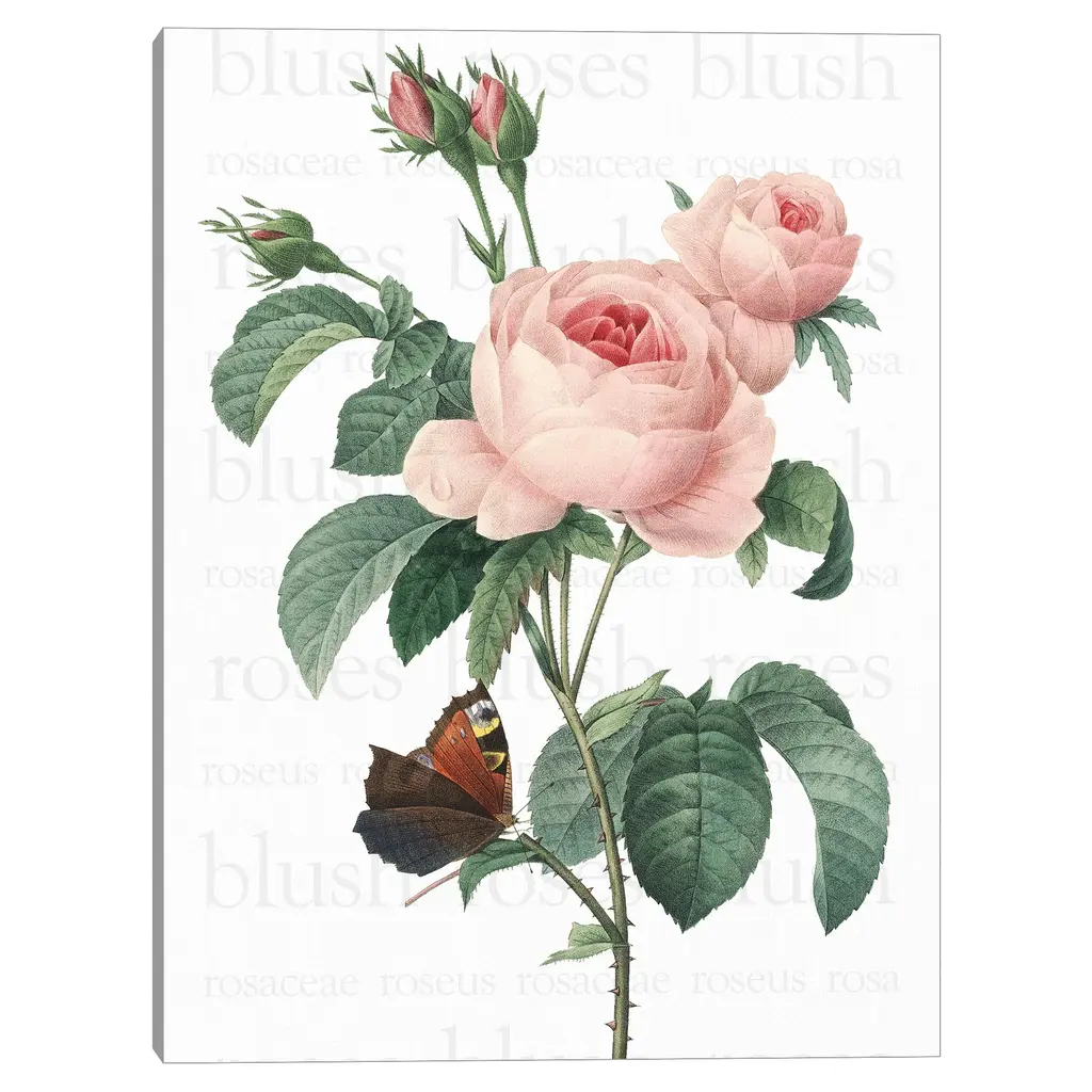 When a rose blooms, it ignites with exhilarating fragrance and glorious color. Design Lab's Pink Roses 2 Text canvas art print is a portrait of a blush rosebush at the beginning of its journey, accompanied by a gentle butterfly. Hang this eye-catching image in your favorite room.