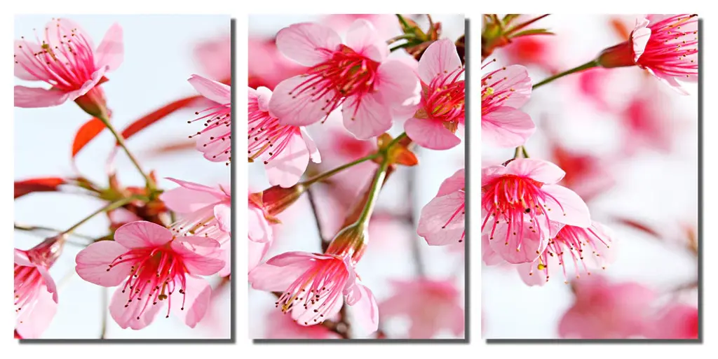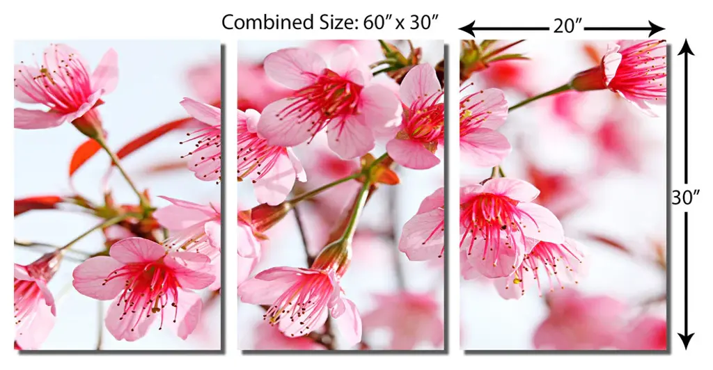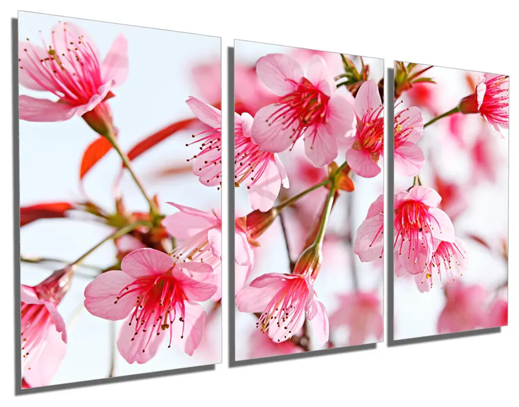 60"œ x 30"œ total size. Ready To Hang! (3 pieces - 20"œ x 30"œ each). 3 Panel Split (Triptych) Pink Sakura Blossom Metal Print. Modern metal wall art for home or office wall decor & interior design. Printed on Luxurious, HD aluminum glossy metal panels. Multi panel art.. HD aluminum panels. Metal print wall art. Includes Shadow Wall Mount on the back.• Aluminum Metal Wall Art• Made in USA• Ready to hang - No assembly required• Shadow mount hardware on the back• 0.045"œ thick HD Aluminum Panels• Scratch resistant, glossy finish• Superb color clarity, luxurious prints• Epson printing process• For indoor or moisture rich environment use• Easy to clean. Gently wipe with microfiber cloth.