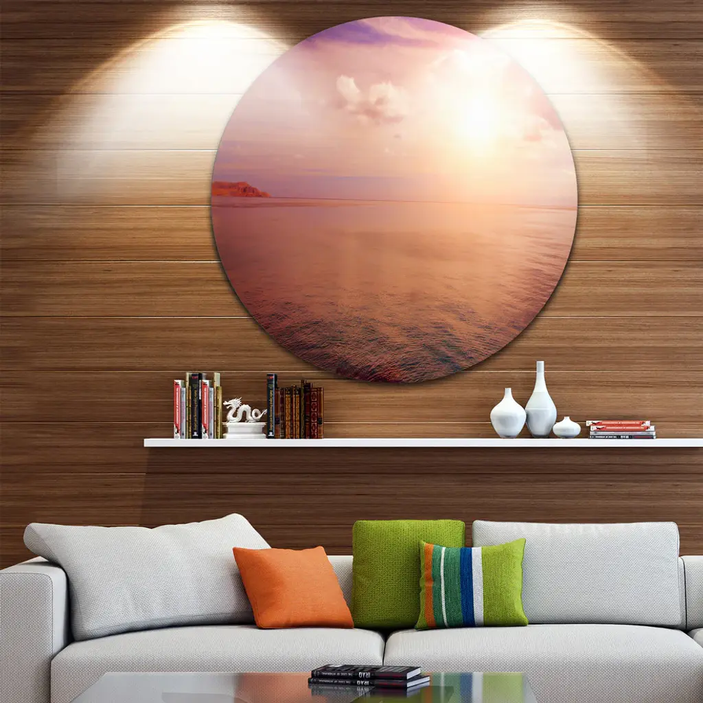 Bring Contemporary Abstraction to your home with this large Circle Metal wall art. This Pink Sky Over Dark Beach at Sunset Metal Artwork makes it the focal point of any room or office. - White Gloss Coating ensures colors are extra vibrant with light reflection.- Aluminum grade Sheet Metal with 1 inch mounting frame on the back giving the illusion that the artwork is floating on the wall..- Mounting Brackets are included along with instructions.- High Quality Digital images are created directly into a glossy aluminum panel producing a stunning and captivating print into the glossy finish of the metal.- Water, Fire and Scratch resistant HD Aluminum panels.- Looks better than any photo paper and guaranteed to last at least 20 years- Easy to clean with a microfiber cloth. Colors are far superior to regular Canvas Art. - Easy to Hang