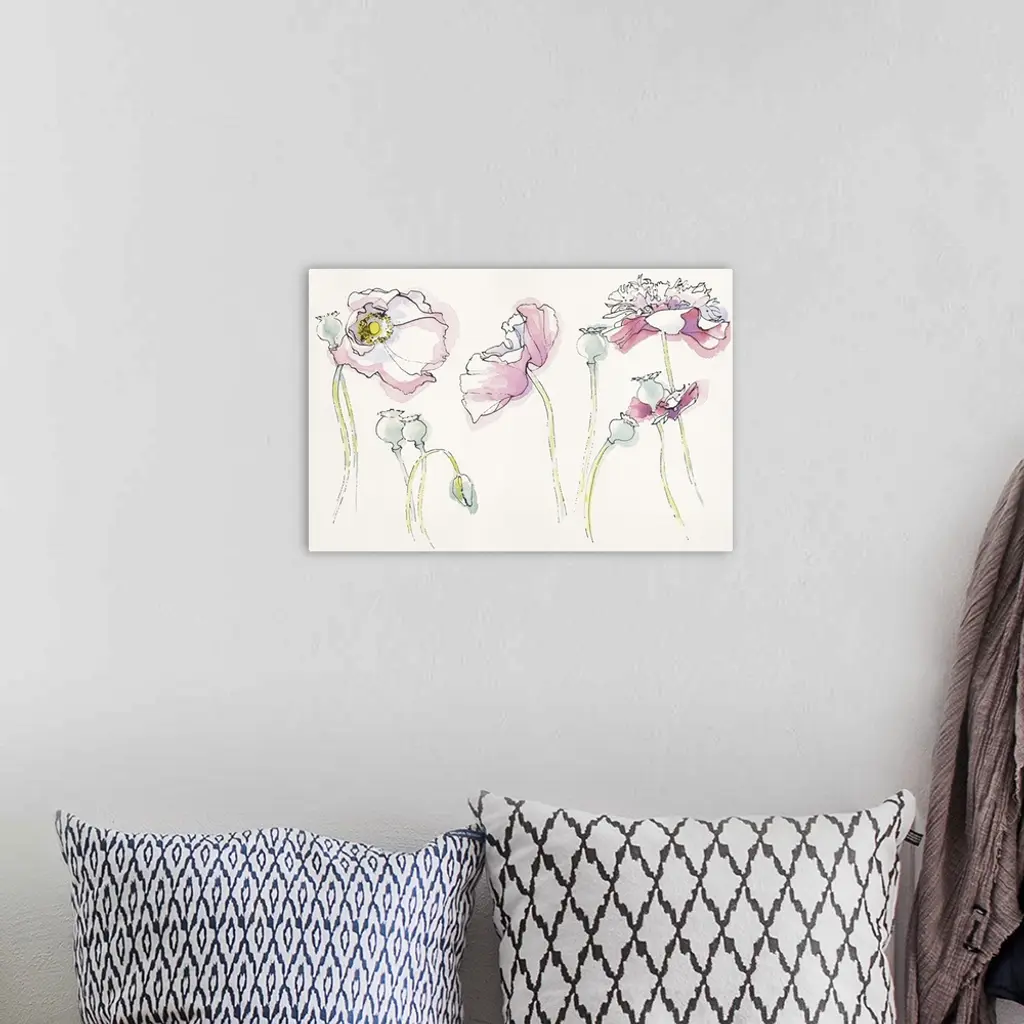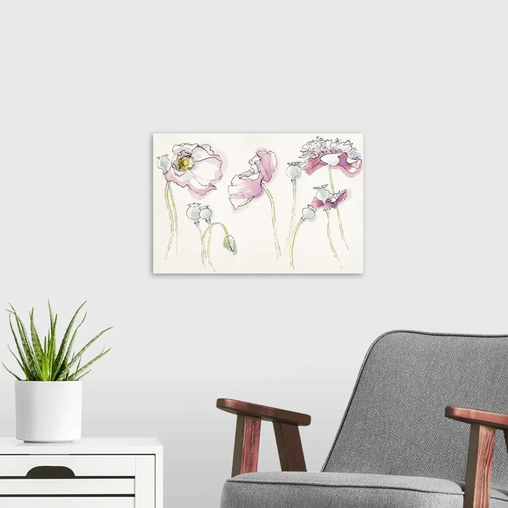 Watercolor painting of soft pink flowers in different positions against a neutral toned background.