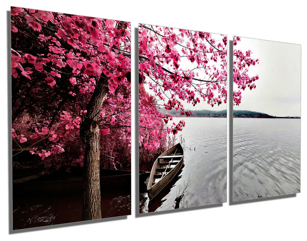 Pink Tree, A Boat And Lake Metal Print Wall Art, 3 Panel Split, Triptych, 60x30