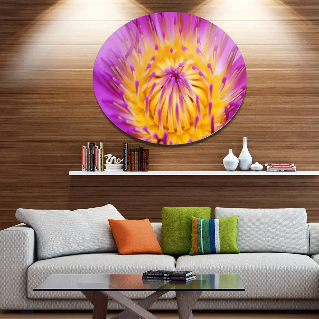 Bring Contemporary Abstraction to your home with this large Circle Metal wall art. This Pink Yellow Abstract Lotus Flower Metal Artwork makes it the focal point of any room or office. - White Gloss Coating ensures colors are extra vibrant with light reflection.- Aluminum grade Sheet Metal with 1 inch mounting frame on the back giving the illusion that the artwork is floating on the wall..- Mounting Brackets are included along with instructions.- High Quality Digital images are created directly into a glossy aluminum panel producing a stunning and captivating print into the glossy finish of the metal.- Water, Fire and Scratch resistant HD Aluminum panels.- Looks better than any photo paper and guaranteed to last at least 20 years- Easy to clean with a microfiber cloth. Colors are far superior to regular Canvas Art. - Easy to Hang