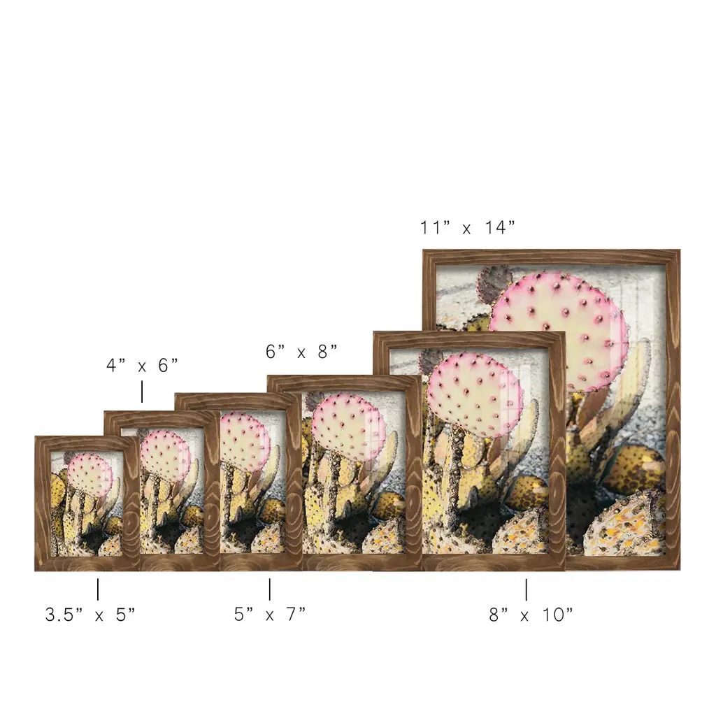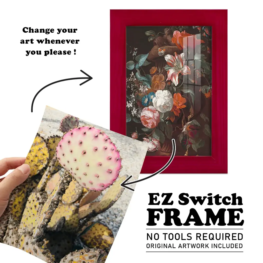 Pink Yellow Cactus II -EZ SWITCH Framed Print w/glass-Cherry Red A delightful, framed print. Featuring a solid wood frame with real wood glass. This premium print is giclee quality. In addition, every frame features a removable back and table top stand. This allows you to change your art in the future or to just stand the art on a table for a new look. We are sure you'll enjoy our new series of EZ SWITCH Framed Art. Solid Wood Frame Real Glass Removable / Replaceable Art Built in Tabletop Stand Sizes range from 4x6 up to 12x15 - buy just one or pair them up as sets as you see fit.
