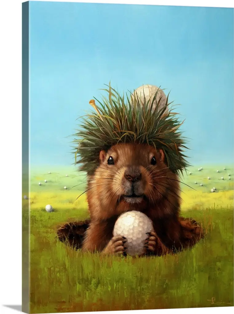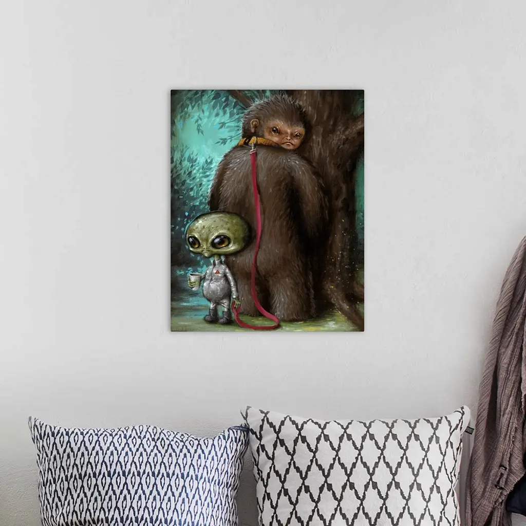 Surrealist painting of an alien holding a leash attached to a creature resembling a Sasquatch standing by a tree.