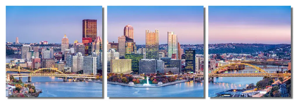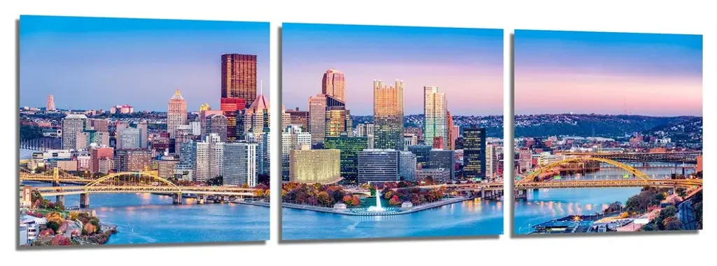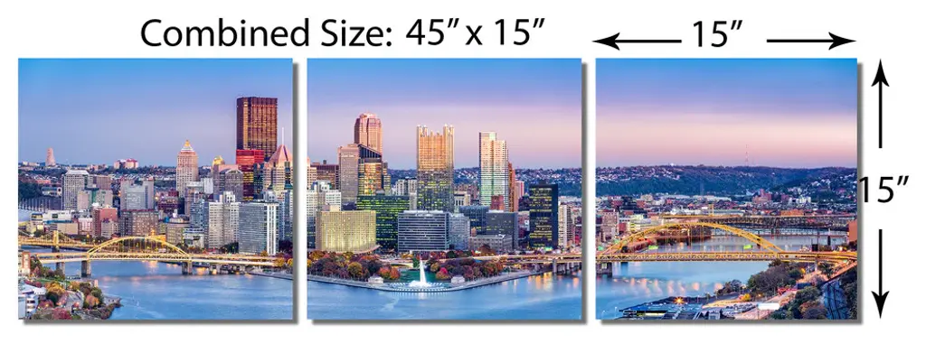 45" x 15" total size. Ready To Hang! (3 pieces - 15" x 15" each). 3 Panel Split (Triptych) Metal Print of Pittsburgh, Pennsylvania skyline. Monongahela River, City of bridges panoramic wall art. For home or office wall decor & interior design. Printed on Luxurious, HD aluminum glossy metal panels. Multi panel art.. HD aluminum panels. Metal print wall art. Includes Shadow Wall Mount on the back.• Aluminum Metal Wall Art• Made in USA• Ready to hang - No assembly required• Shadow mount hardware on the back• 0.045" thick HD Aluminum Panels• Scratch resistant, glossy finish• Superb color clarity, luxurious prints• Epson printing process• For indoor or moisture rich environment use• Easy to clean. Gently wipe with microfiber cloth.