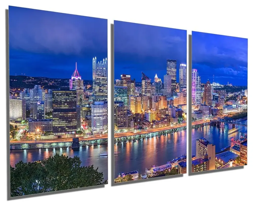 48" x 24" total size. Ready To Hang! (3 pieces - 16" x 24" each). 3 Panel Split (Triptych) Metal Print of Pittsburgh, Pennsylvania skyline at dusk. Monongahela River, City of bridges. Modern metal wall art for home or office wall decor, interior design. Printed on Luxurious, HD aluminum glossy metal panels. Multi panel.. HD aluminum panels. Metal print wall art. Includes Shadow Wall Mount on the back.• Aluminum Metal Wall Art• Made in USA• Ready to hang - No assembly required• Shadow mount hardware on the back• 0.045" thick HD Aluminum Panels• Scratch resistant, glossy finish• Superb color clarity, luxurious prints• Epson printing process• For indoor or moisture rich environment use• Easy to clean. Gently wipe with microfiber cloth.