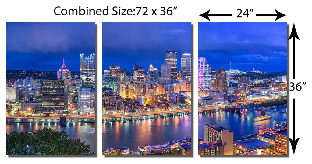 72" x 36" total size. Ready To Hang! (3 pieces - 24" x 36" each). 3 Panel Split (Triptych) Metal Print of Pittsburgh, Pennsylvania skyline at dusk. Monongahela River, City of bridges. Modern metal wall art for home or office wall decor, interior design. Printed on Luxurious, HD aluminum glossy metal panels. Multi panel.. HD aluminum panels. Metal print wall art. Includes Shadow Wall Mount on the back.• Aluminum Metal Wall Art• Made in USA• Ready to hang - No assembly required• Shadow mount hardware on the back• 0.045" thick HD Aluminum Panels• Scratch resistant, glossy finish• Superb color clarity, luxurious prints• Epson printing process• For indoor or moisture rich environment use• Easy to clean. Gently wipe with microfiber cloth.
