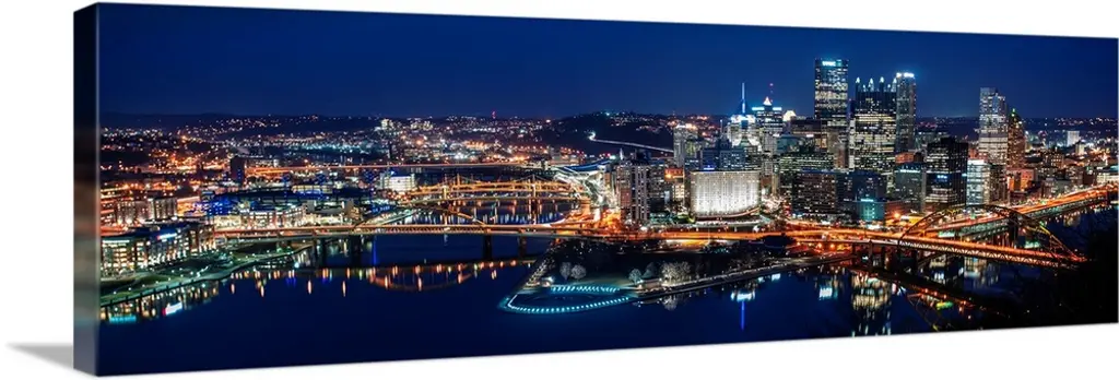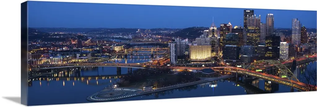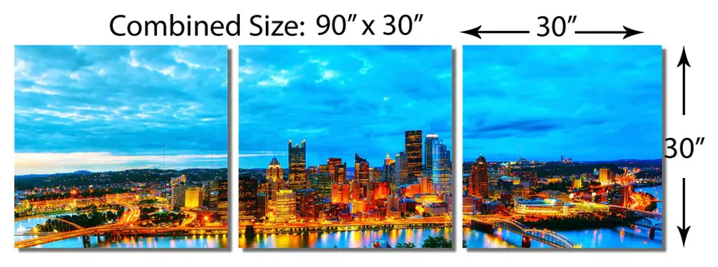 90" x 30" total size. Ready To Hang! (3 pieces - 30" x 30" each). 3 Panel Split (Triptych) Metal Print of Pittsburgh, Pennsylvania skyline blue. Monongahela River, City of bridges panoramic wall art. For home or office wall decor & interior design. Luxurious, HD aluminum glossy metal panels. Multi panel art.. HD aluminum panels. Metal print wall art. Includes Shadow Wall Mount on the back.• Aluminum Metal Wall Art• Made in USA• Ready to hang - No assembly required• Shadow mount hardware on the back• 0.045" thick HD Aluminum Panels• Scratch resistant, glossy finish• Superb color clarity, luxurious prints• Epson printing process• For indoor or moisture rich environment use• Easy to clean. Gently wipe with microfiber cloth.