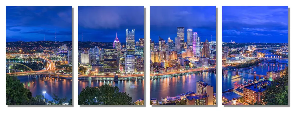 64" x 24" total size. Ready To Hang! (4 pieces - 16" x 24" each). 4 Panel Split Panoramic Metal Print view of Pittsburgh, Pennsylvania skyline at dusk, Monongahela River. Modern metal wall art for home or office wall decor & interior design. Printed on Luxurious, HD aluminum glossy metal panels. Multi panel art.. HD aluminum panels. Metal print wall art. Includes Shadow Wall Mount on the back.• Aluminum Metal Wall Art• Made in USA• Ready to hang - No assembly required• Shadow mount hardware on the back• 0.045" thick HD Aluminum Panels• Scratch resistant, glossy finish• Superb color clarity, luxurious prints• Epson printing process• For indoor or moisture rich environment use• Easy to clean. Gently wipe with microfiber cloth.