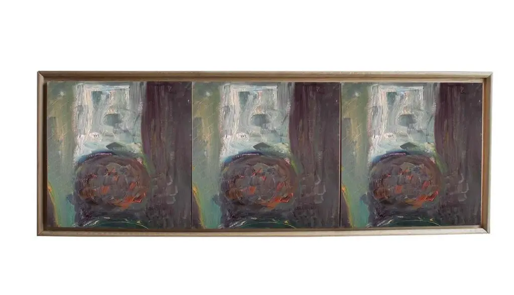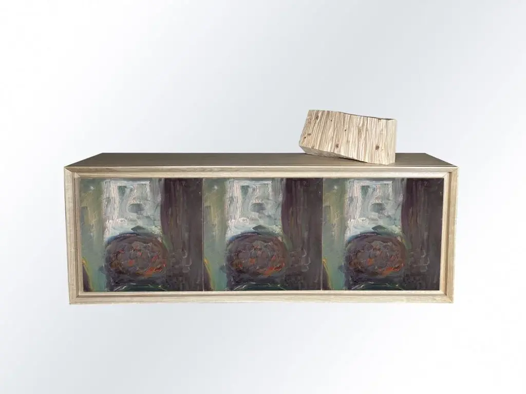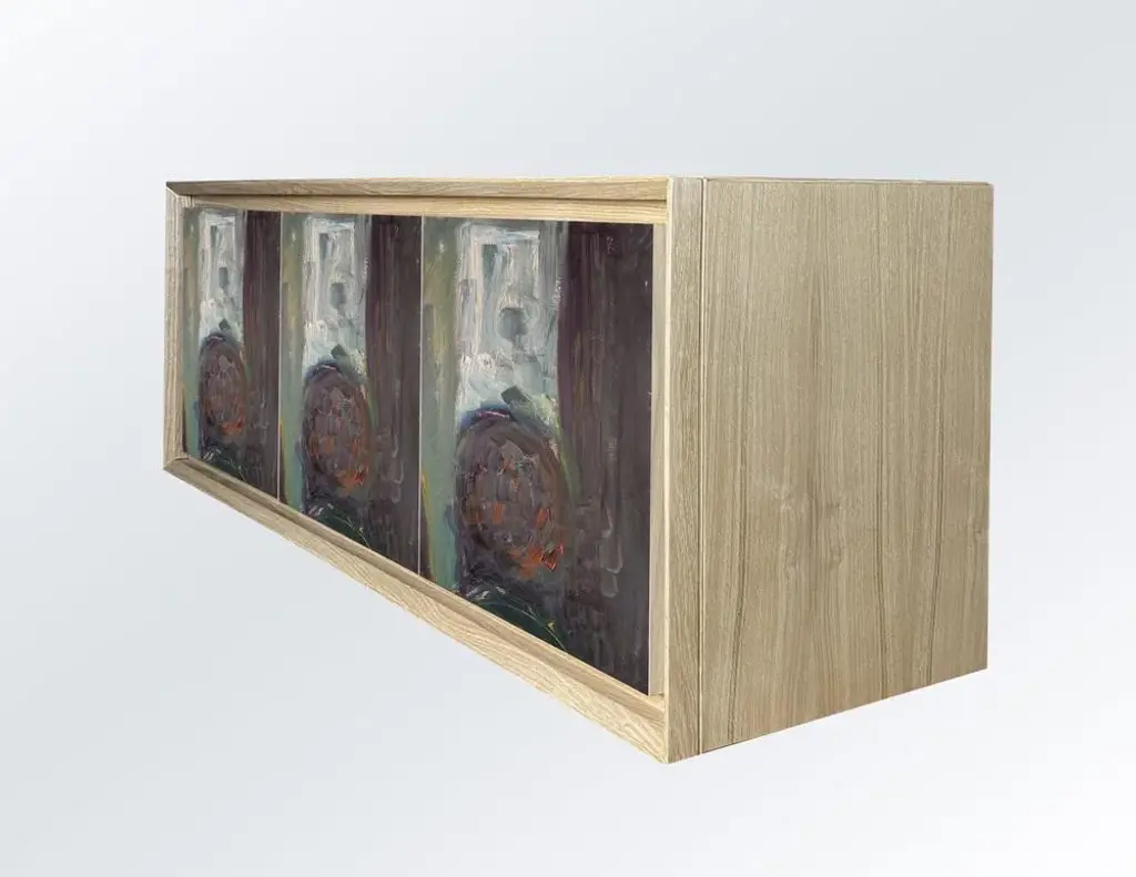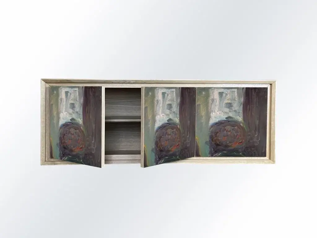 "Painting Credenza Uno" by Mascia Meccani for Meccani Design, 2022. The suspended belief is handmade in oak with 3 doors and 2 internal shelves. The doors are decorated by hand. Limited edition of 10 pieces all numbered and signed. Labeled by Maker,Numbered